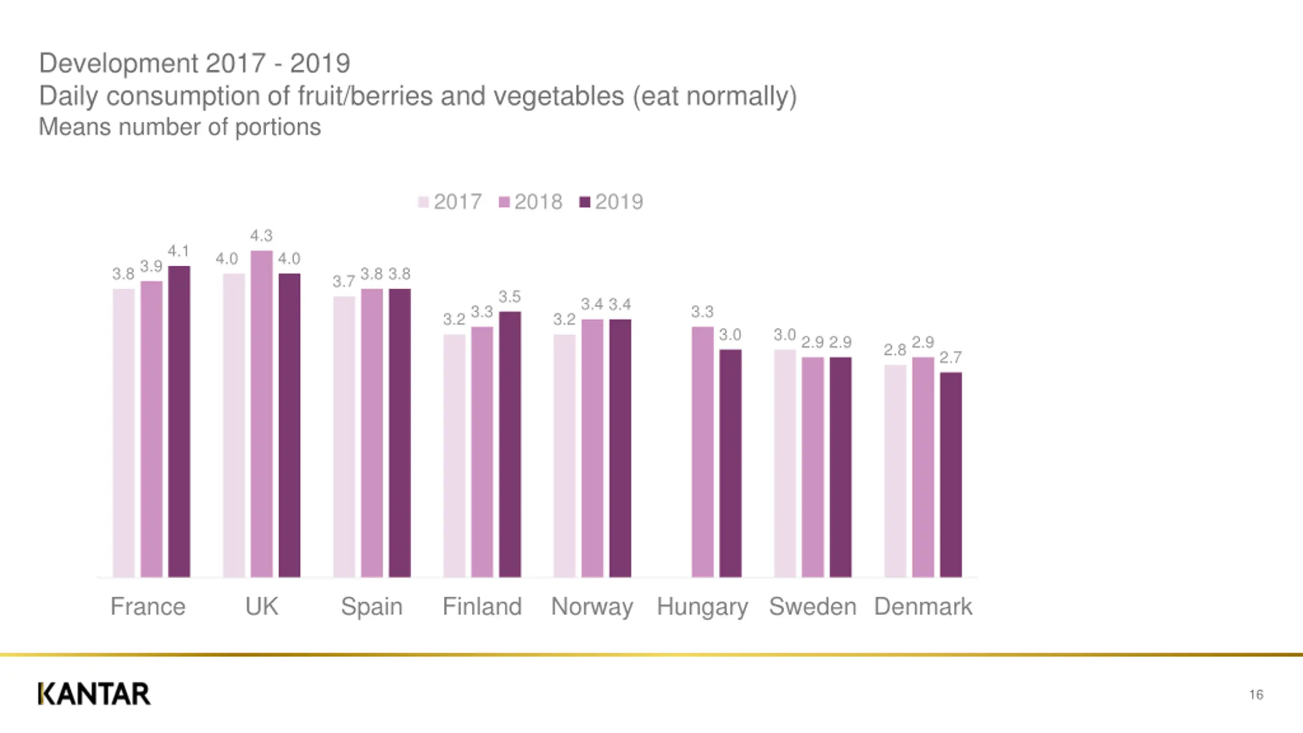 Development 2017 - 2019 Share of the population eating at least 5 portions of fruit/berries or vegetables on a daily basis (eat normally) The share of the population eating at least 5 portions on a daily basis has increased significantly from 2017 to 2019 in France, Spain and Finland. 2017 2018 2019 43.3 % 40.3 % 39.7 % 38.9 % 35.3 % 34.8 % 34.2 % 30.7 % 29.3 % 26.8 % 26.3 % 24.9 % 24.0 % 23.9 % 22.9 % 21.0 % 19.0 % 16.3 % 19.3 % 18.7 % 18.2 % 16.6 % 16.2 % UK France Spain Finland Norway Hungary Denmark Sweden 15