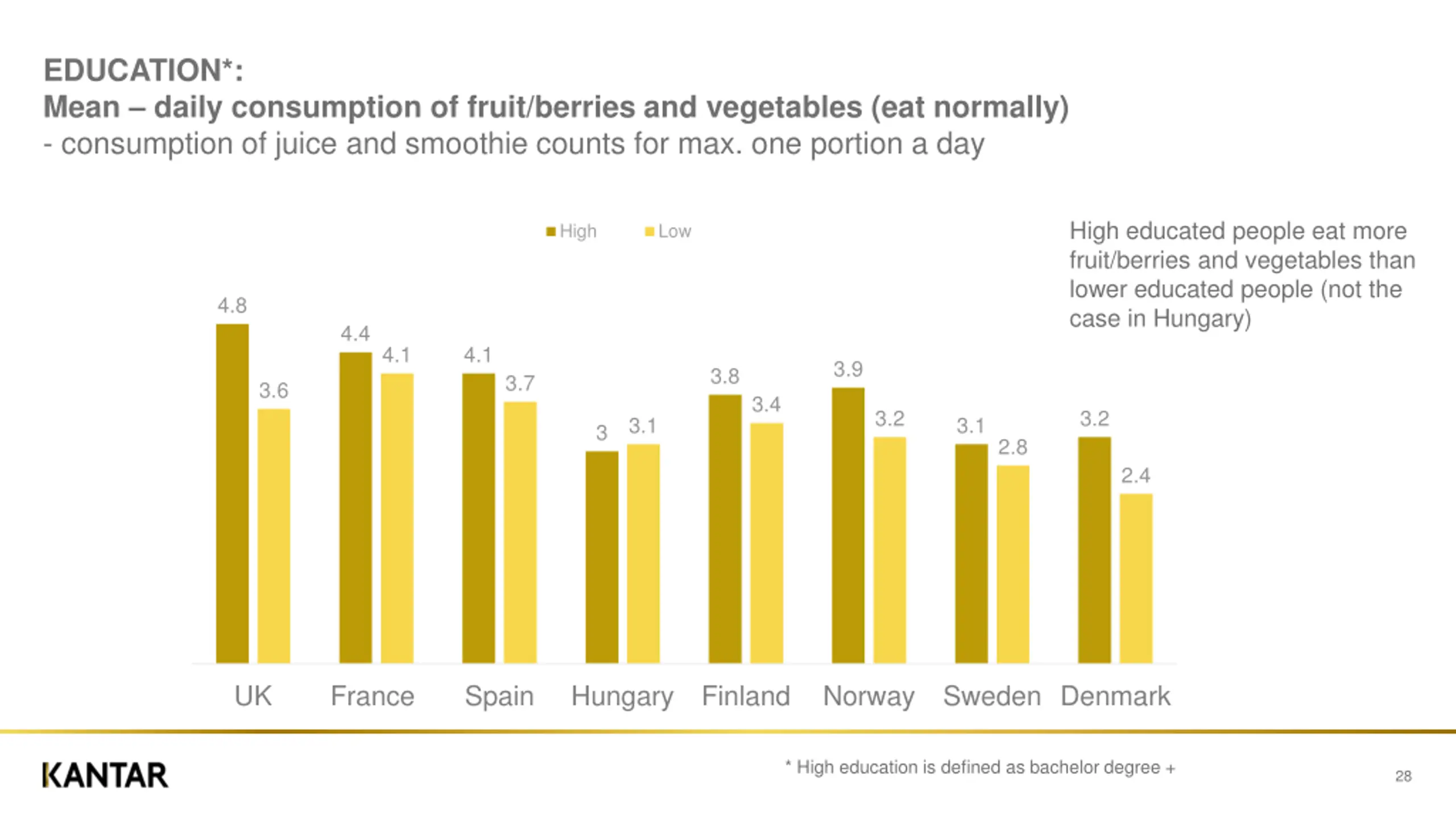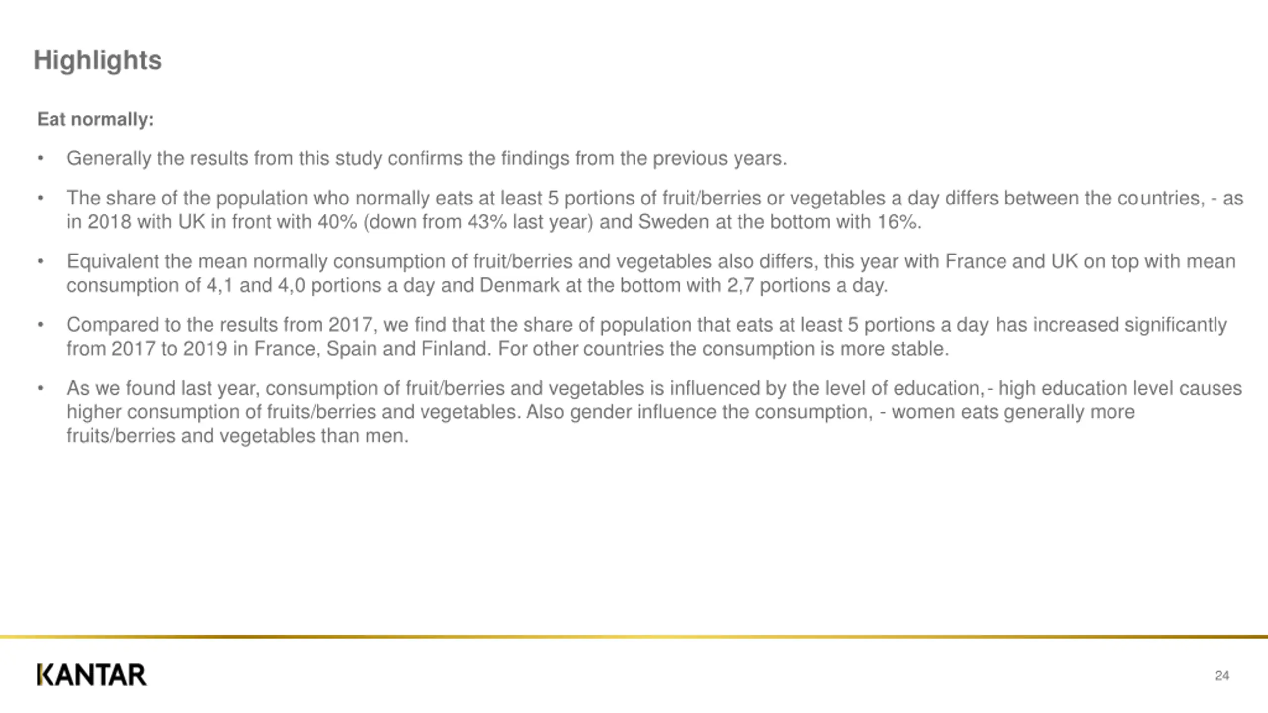 Highlights Eat normally: Generally the results from this study confirms the findings from the previous years. The share of the population who normally eats at least 5 portions of fruit/berries or vegetables a day differs between the countries, - as in 2018 with UK in front with 40% (down from 43% last year) and Sweden at the bottom with 16%. Equivalent the mean normally consumption of fruit/berries and vegetables also differs, this year with France and UK on top with mean consumption of 4,1 and 4,0 portions a day and Denmark at the bottom with 2,7 portions a day. Compared to the results from 2017, we find that the share of population that eats at least 5 portions a day has increased significantly from 2017 to 2019 in France, Spain and Finland. For other countries the consumption is more stable. As we found last year, consumption of fruit/berries and vegetables is influenced by the level of education,- high education level causes higher consumption of fruits/berries and vegetables. Also gender influence the consumption, - women eats generally more fruits/berries and vegetables than men. 24