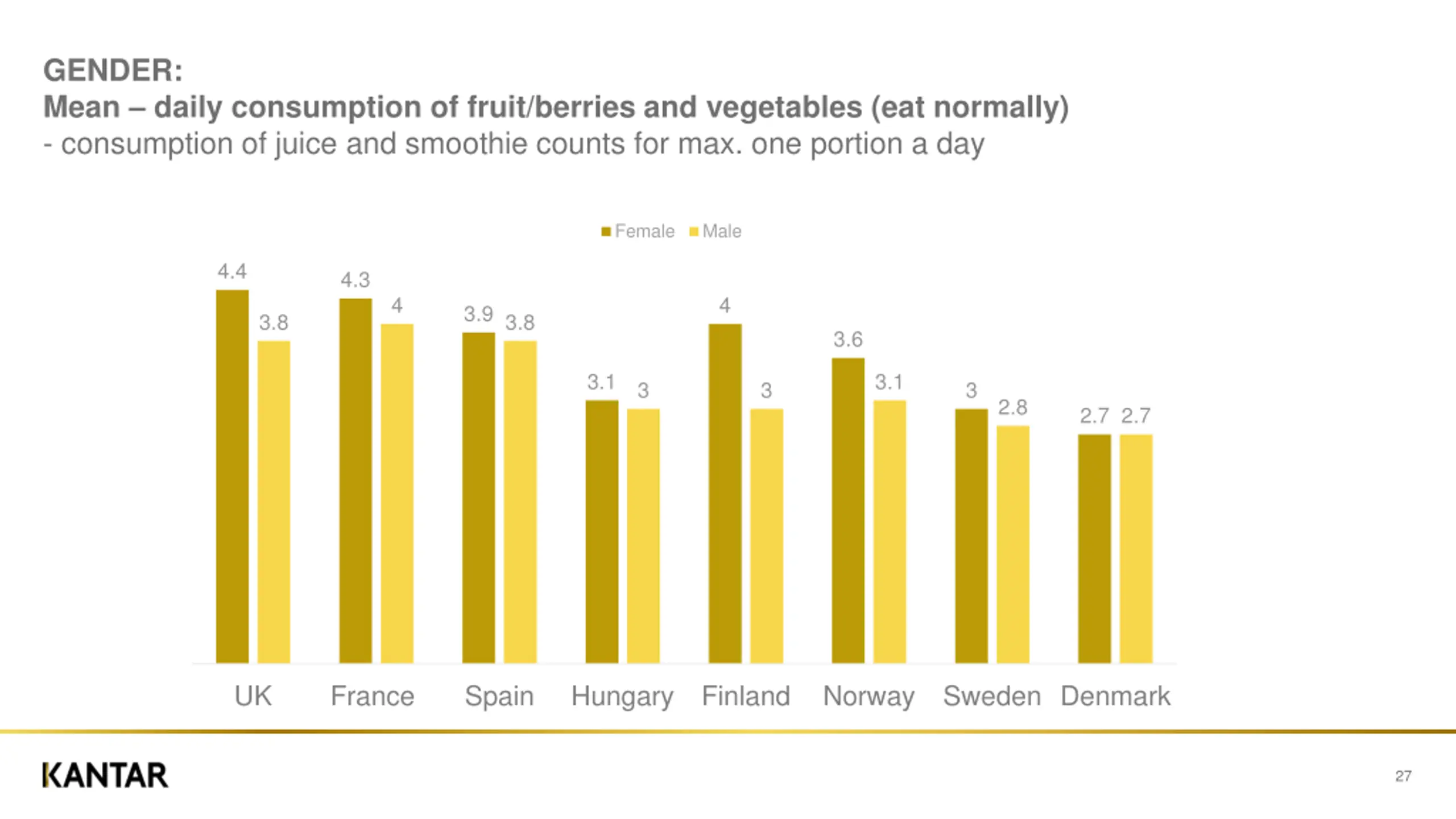 GENDER: Mean daily consumption of fruit/berries and vegetables (eat normally) - consumption of juice and smoothie counts for max. one portion a day Female Male 4.4 4.3 4 4 3.9 3.8 3.8 3.6 3.1 3.1 3 3 3 2.8 2.7 2.7 UK France Spain Hungary Finland Norway Sweden Denmark 27