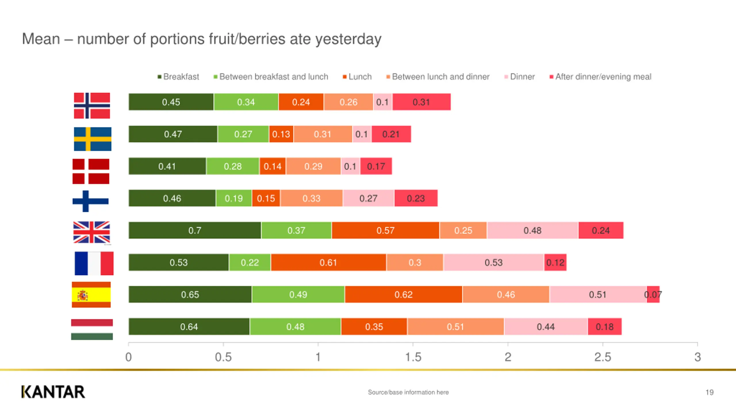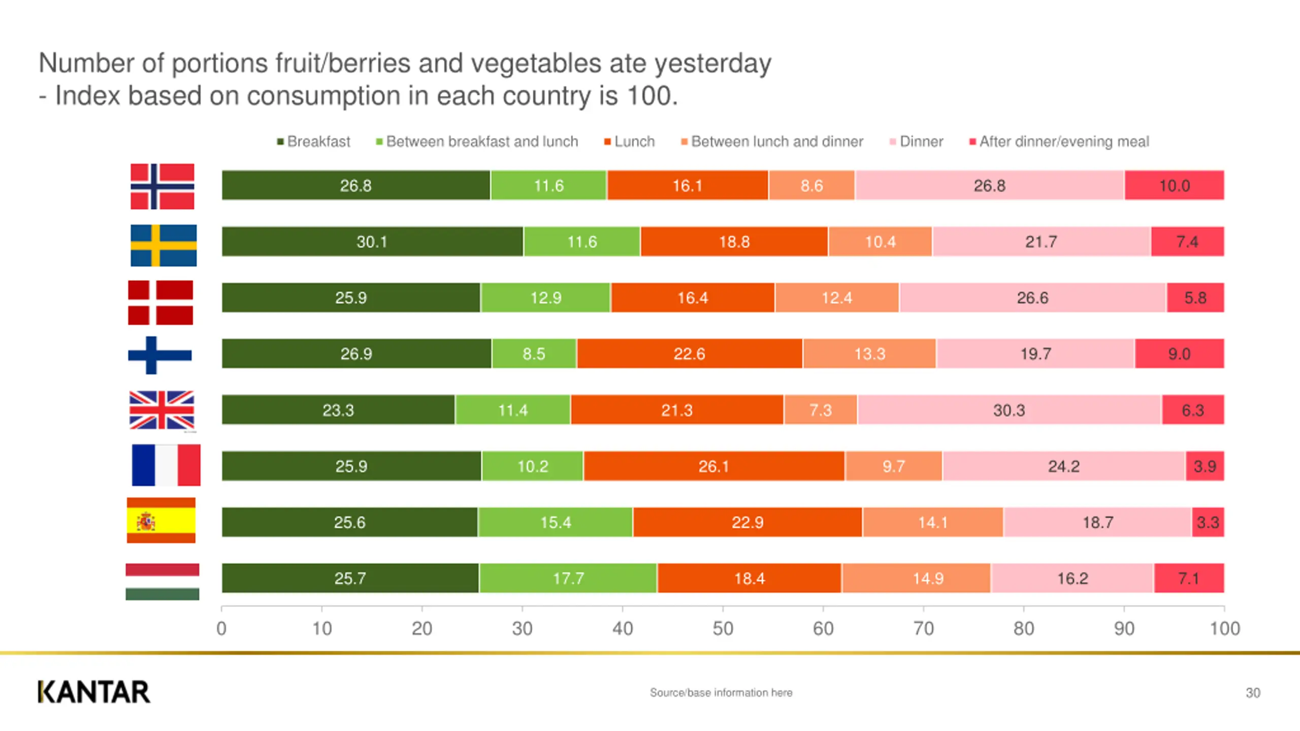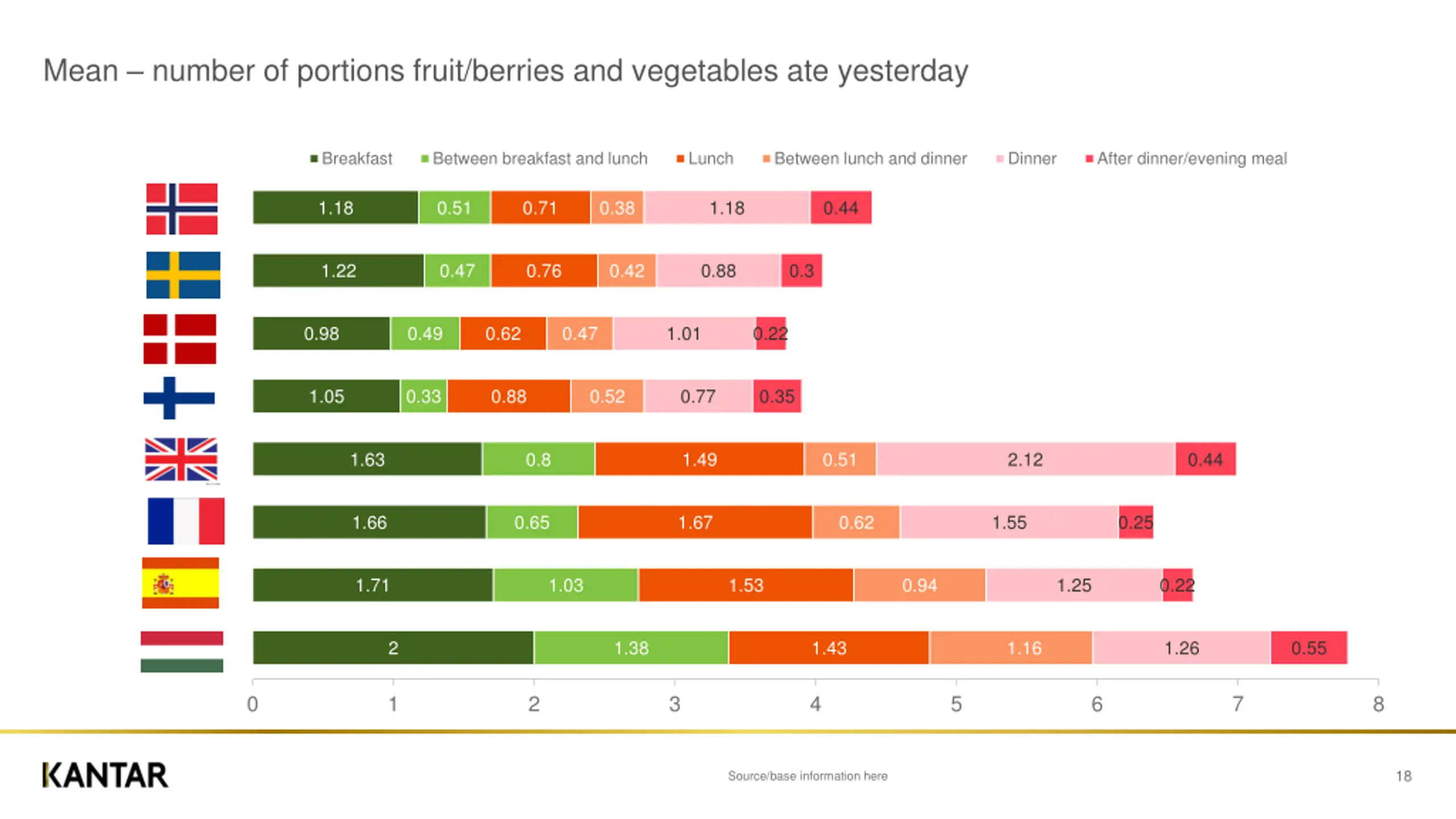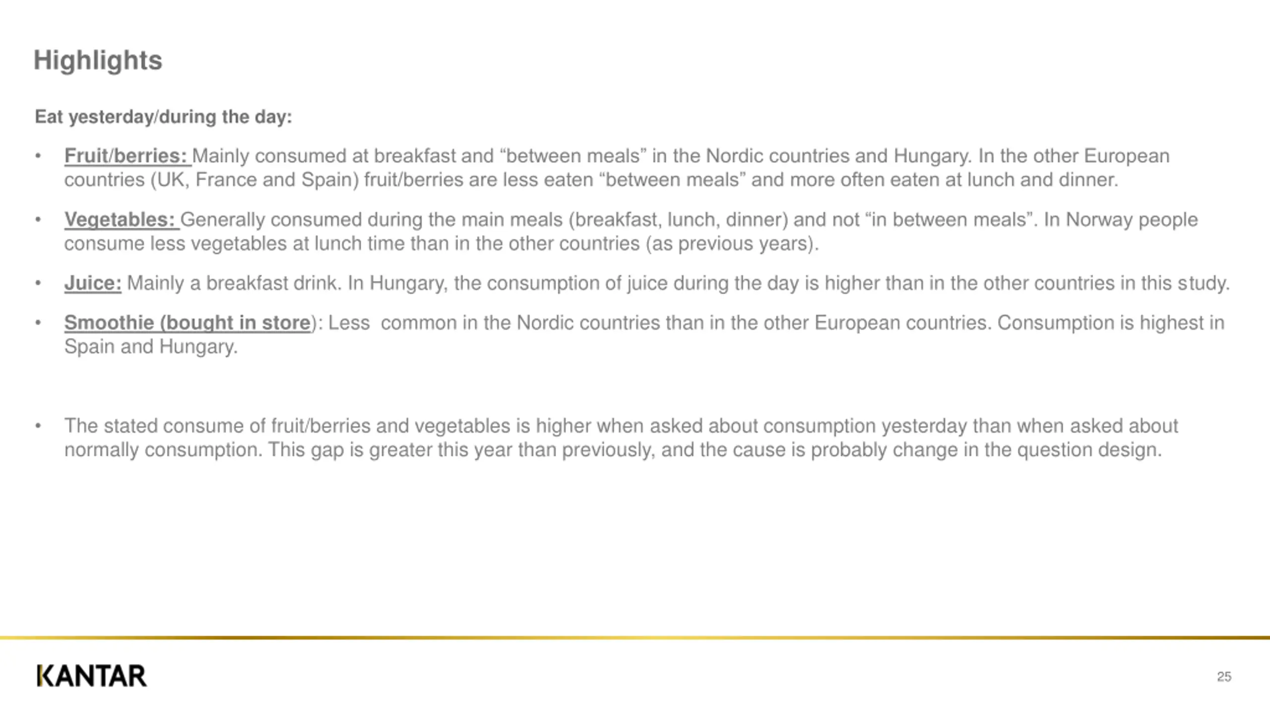 Highlights Eat yesterday/during the day: Fruit/berries: Mainly consumed at breakfast and between meals in the Nordic countries and Hungary. In the other European countries (UK, France and Spain) fruit/berries are less eaten between meals and more often eaten at lunch and dinner. Vegetables: Generally consumed during the main meals (breakfast, lunch, dinner) and not in between meals . In Norway people consume less vegetables at lunch time than in the other countries (as previous years). Juice: Mainly a breakfast drink. In Hungary, the consumption of juice during the day is higher than in the other countries in this study. Smoothie (bought in store): Less common in the Nordic countries than in the other European countries. Consumption is highest in Spain and Hungary. The stated consume of fruit/berries and vegetables is higher when asked about consumption yesterday than when asked about normally consumption. This gap is greater this year than previously, and the cause is probably change in the question design. 25