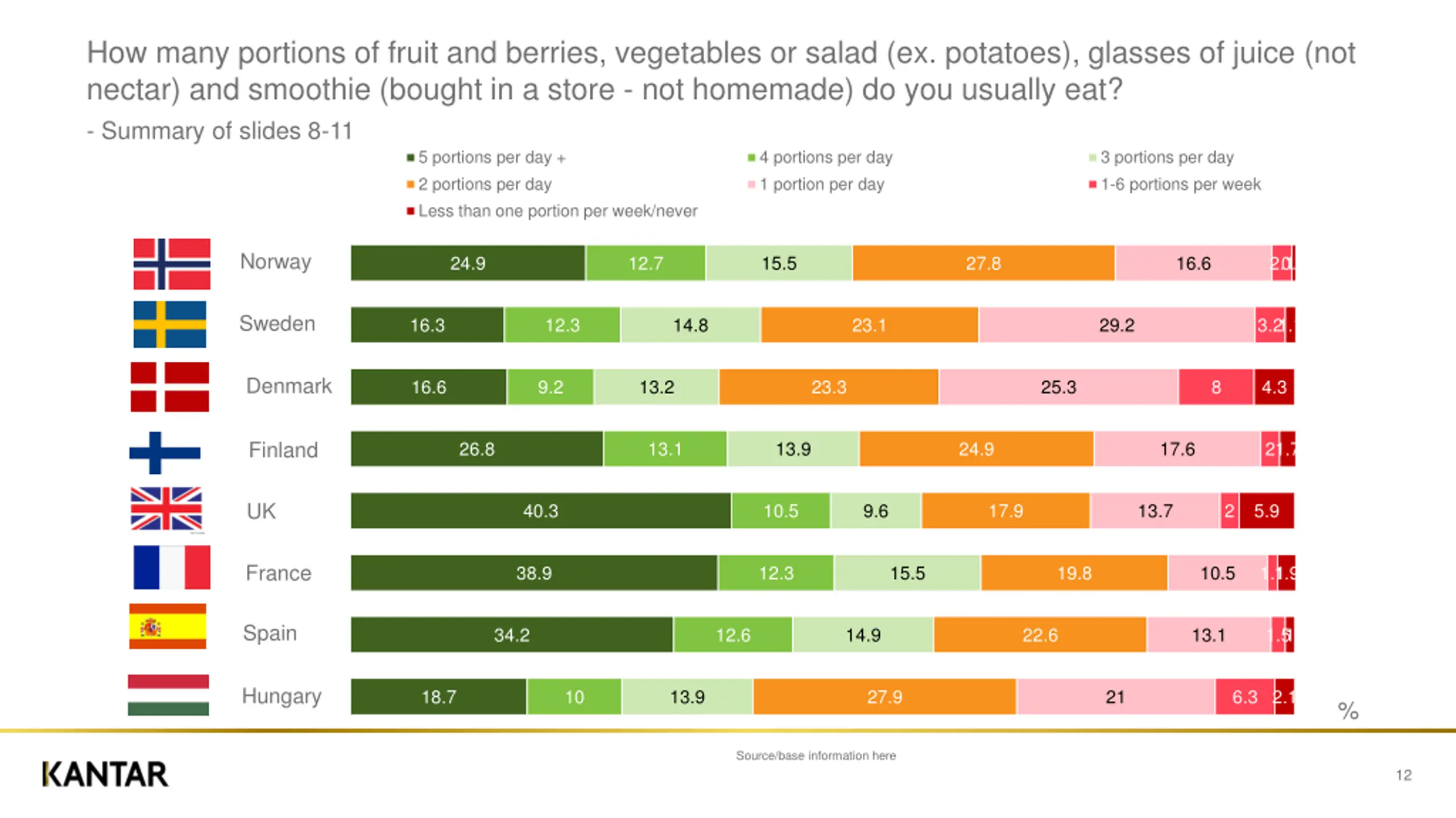 How many portions of fruit and berries, vegetables or salad (ex. potatoes), glasses of juice (not nectar) and smoothie (bought in a store - not homemade) do you usually eat? - Summary of slides 8-11 5 portions per day + 2 portions per day Less than one portion per week/never 4 portions per day 1 portion per day 3 portions per day 1-6 portions per week Norway 24.9 12.7 15.5 27.8 16.6 2.1 0.4 Sweden 16.3 12.3 14.8 23.1 29.2 3.2 1.1 Denmark 16.6 9.2 13.2 23.3 25.3 8 4.3 Finland 26.8 13.1 13.9 24.9 17.6 2 1.7 UK 40.3 10.5 9.6 17.9 13.7 2 5.9 France 38.9 12.3 15.5 19.8 10.5 1.1 1.9 Spain 34.2 12.6 14.9 22.6 13.1 1.5 1 Hungary 18.7 10 13.9 27.9 21 6.3 2.1 % Source/base information here 12