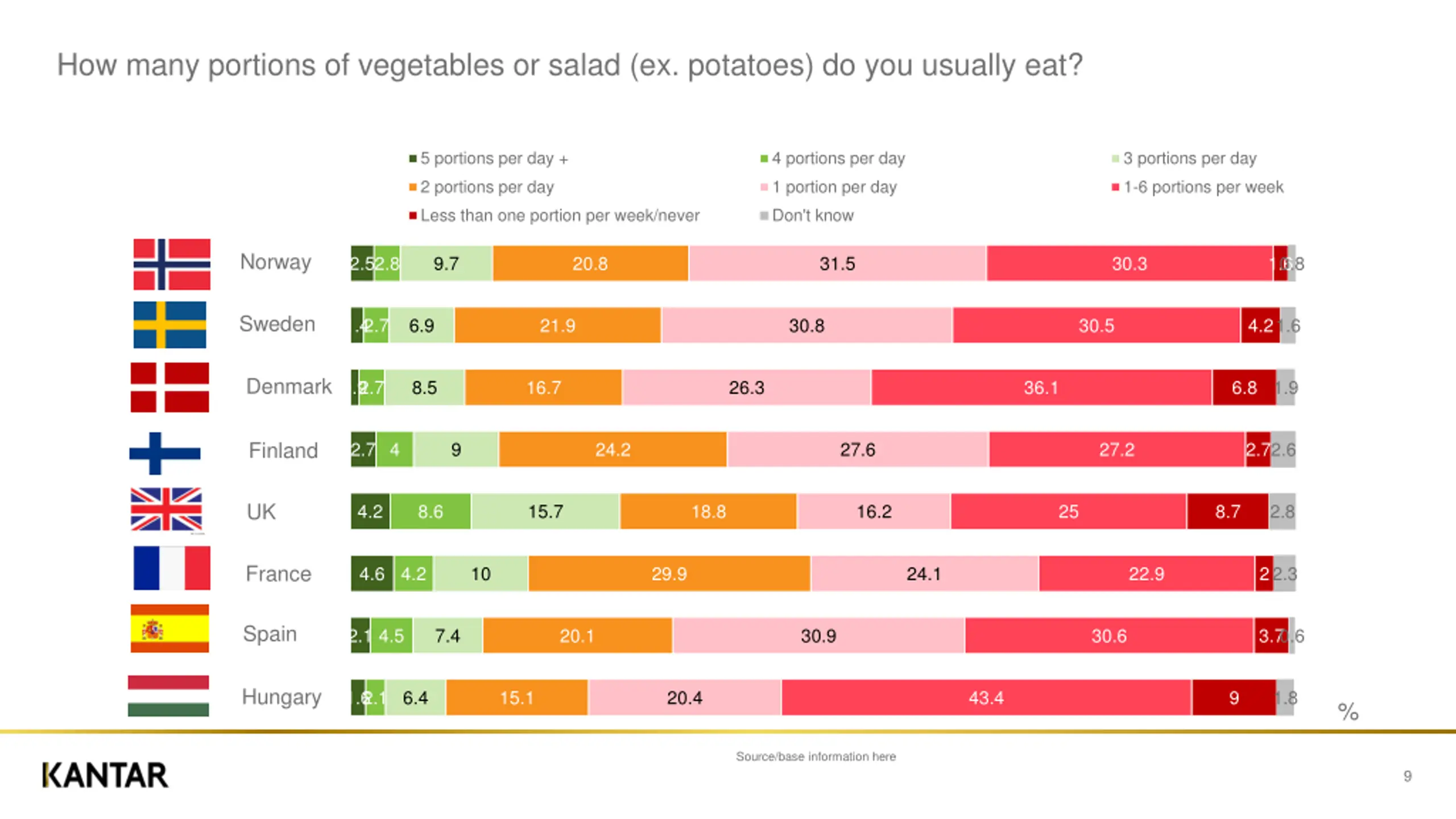 How many portions of vegetables or salad (ex. potatoes) do you usually eat? 5 portions per day + 4 portions per day 3 portions per day 2 portions per day 1 portion per day 1-6 portions per week Less than one portion per week/never Don't know Norway 2.5 2.8 9.7 20.8 31.5 30.3 1.6 0.8 Sweden 1.4 2.7 6.9 21.9 30.8 30.5 4.2 1.6 Denmark 0.9 2.7 8.5 16.7 26.3 36.1 6.8 1.9 Finland 2.7 4 9 24.2 27.6 27.2 2.7 2.6 UK 4.2 8.6 15.7 18.8 16.2 25 8.7 2.8 France 4.6 4.2 10 29.9 24.1 22.9 2 2.3 Spain 2.1 4.5 7.4 20.1 30.9 30.6 3.7 0.6 Hungary 1.6 2.1 6.4 15.1 20.4 43.4 9 1.8 % Source/base information here 9