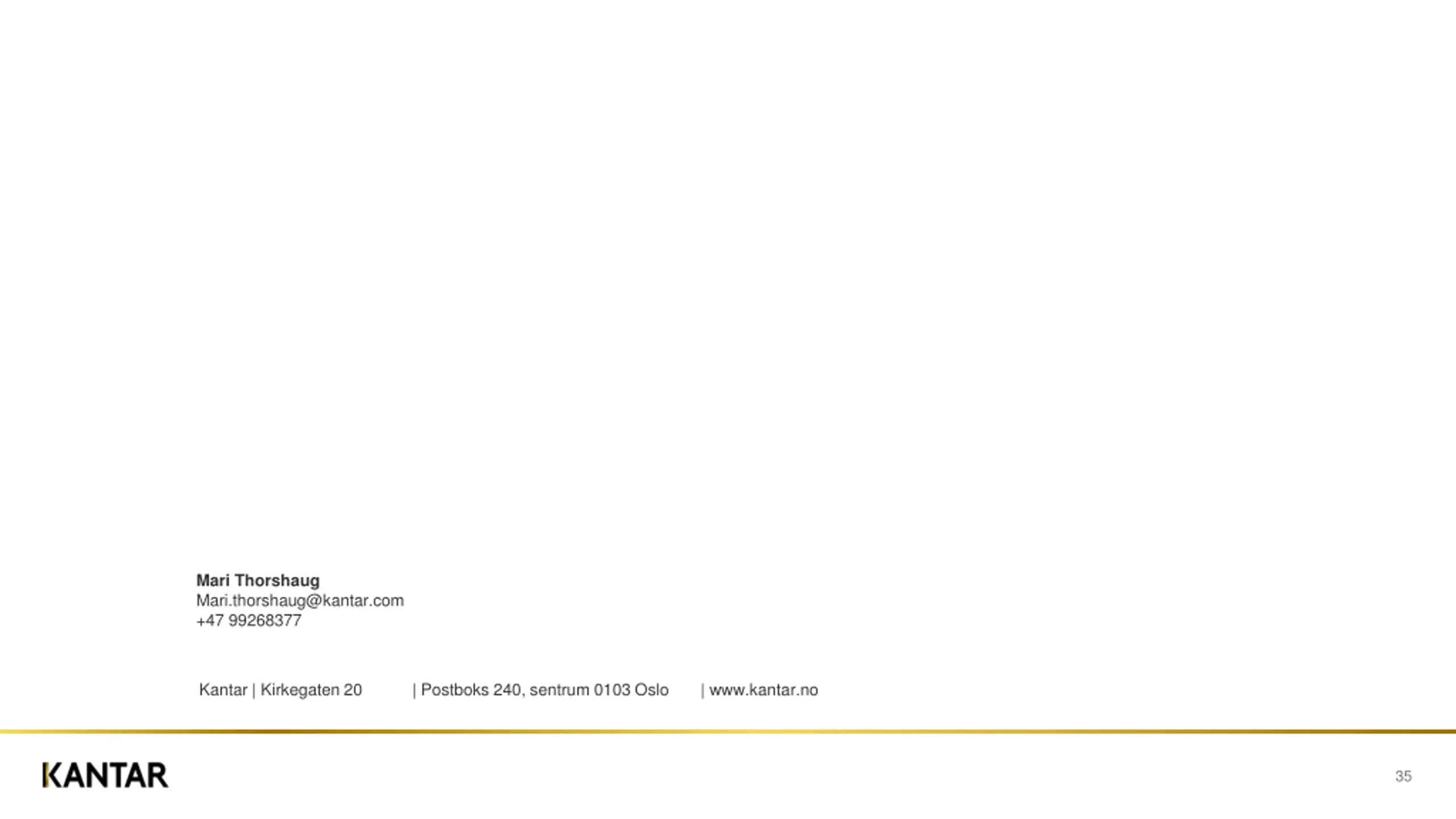 Mari Thorshaug Mari.thorshaug@kantar.com +47 99268377 Kantar | Kirkegaten 20 | Postboks 240, sentrum 0103 Oslo | www.kantar.no 35