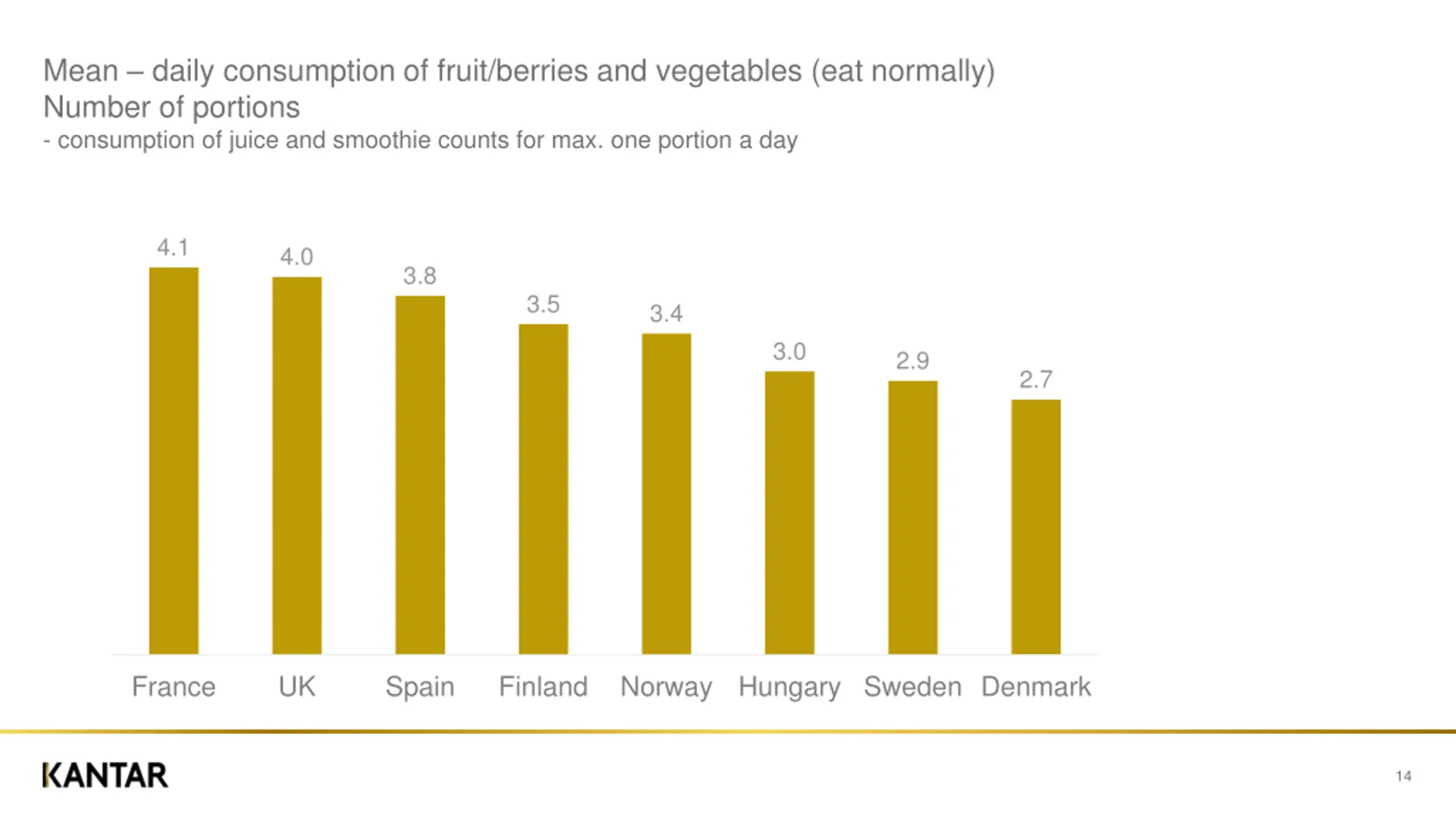 Mean daily consumption of fruit/berries and vegetables (eat normally) Number of portions - consumption of juice and smoothie counts for max. one portion a day 4.1 4.0 3.8 3.5 3.4 3.0 2.9 2.7 France UK Spain Finland Norway Hungary Sweden Denmark 14