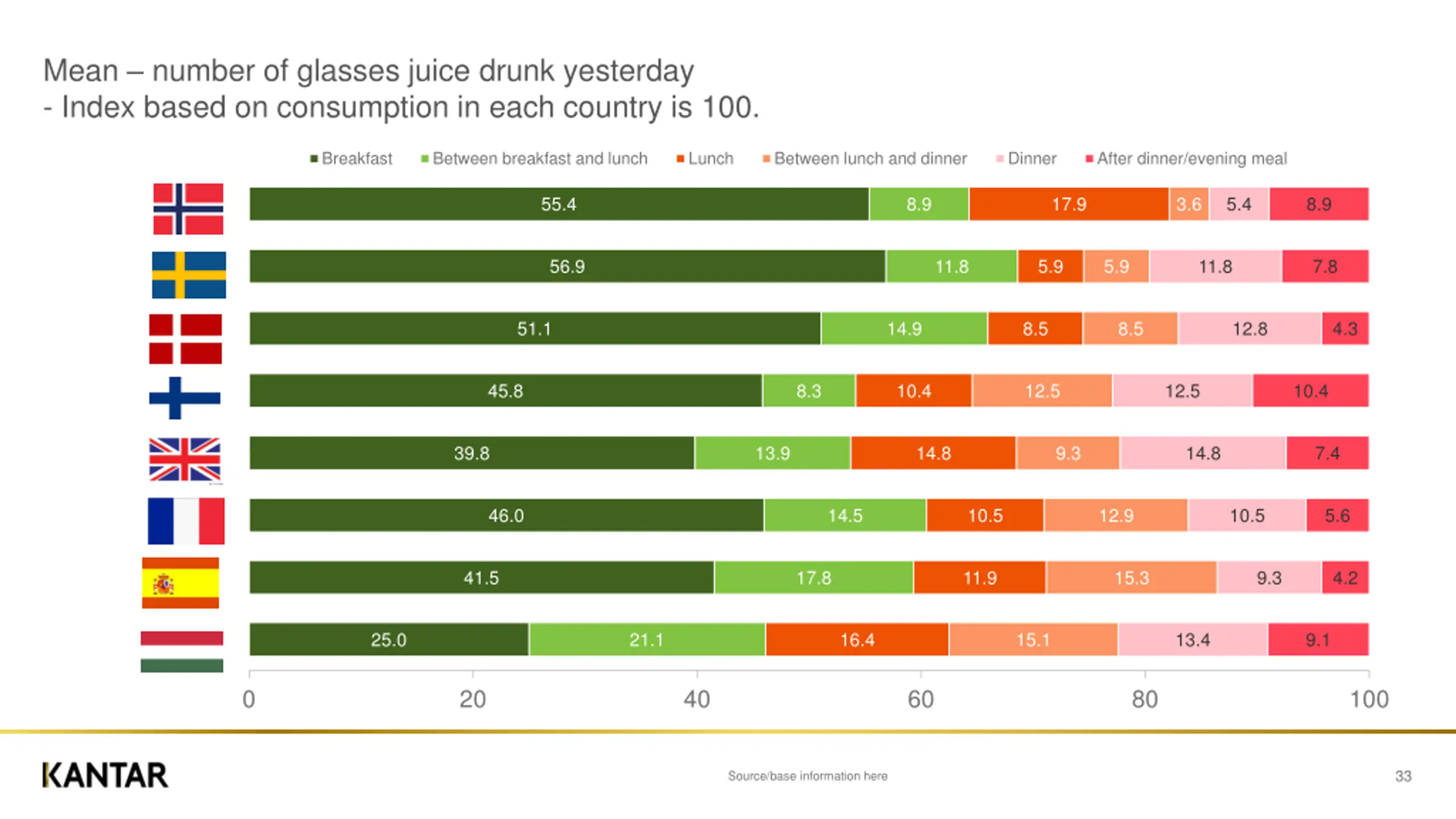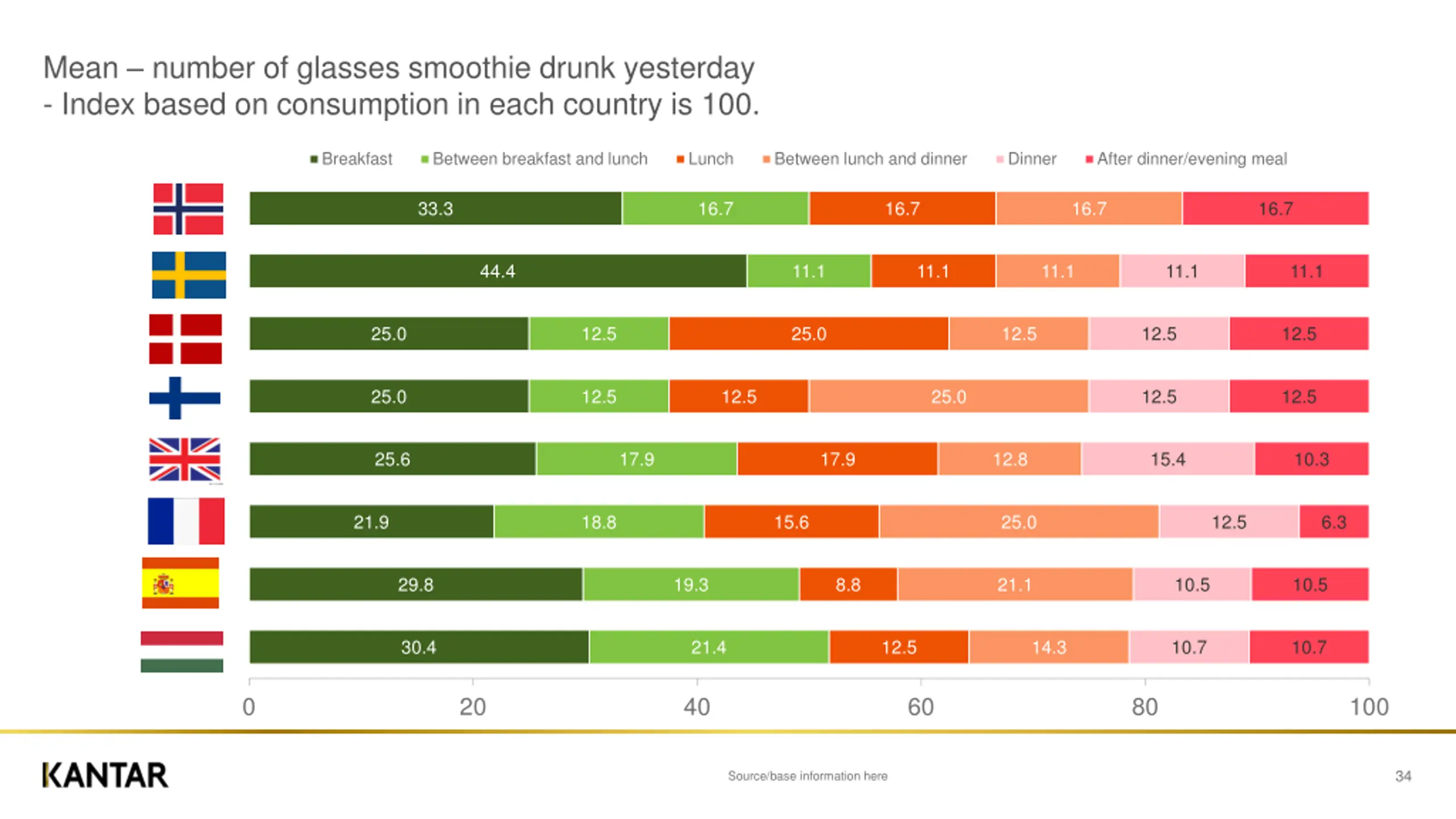 Mean number of glasses juice drunk yesterday - Index based on consumption in each country is 100. Breakfast Between breakfast and lunch Lunch Between lunch and dinner Dinner After dinner/evening meal 55.4 8.9 17.9 3.6 5.4 8.9 56.9 11.8 5.9 5.9 11.8 7.8 51.1 14.9 8.5 8.5 12.8 4.3 45.8 8.3 10.4 12.5 12.5 10.4 39.8 13.9 14.8 9.3 14.8 7.4 46.0 14.5 10.5 12.9 10.5 5.6 41.5 17.8 11.9 15.3 9.3 4.2 25.0 21.1 16.4 15.1 13.4 9.1 0 20 40 60 80 100 33 Source/base information here