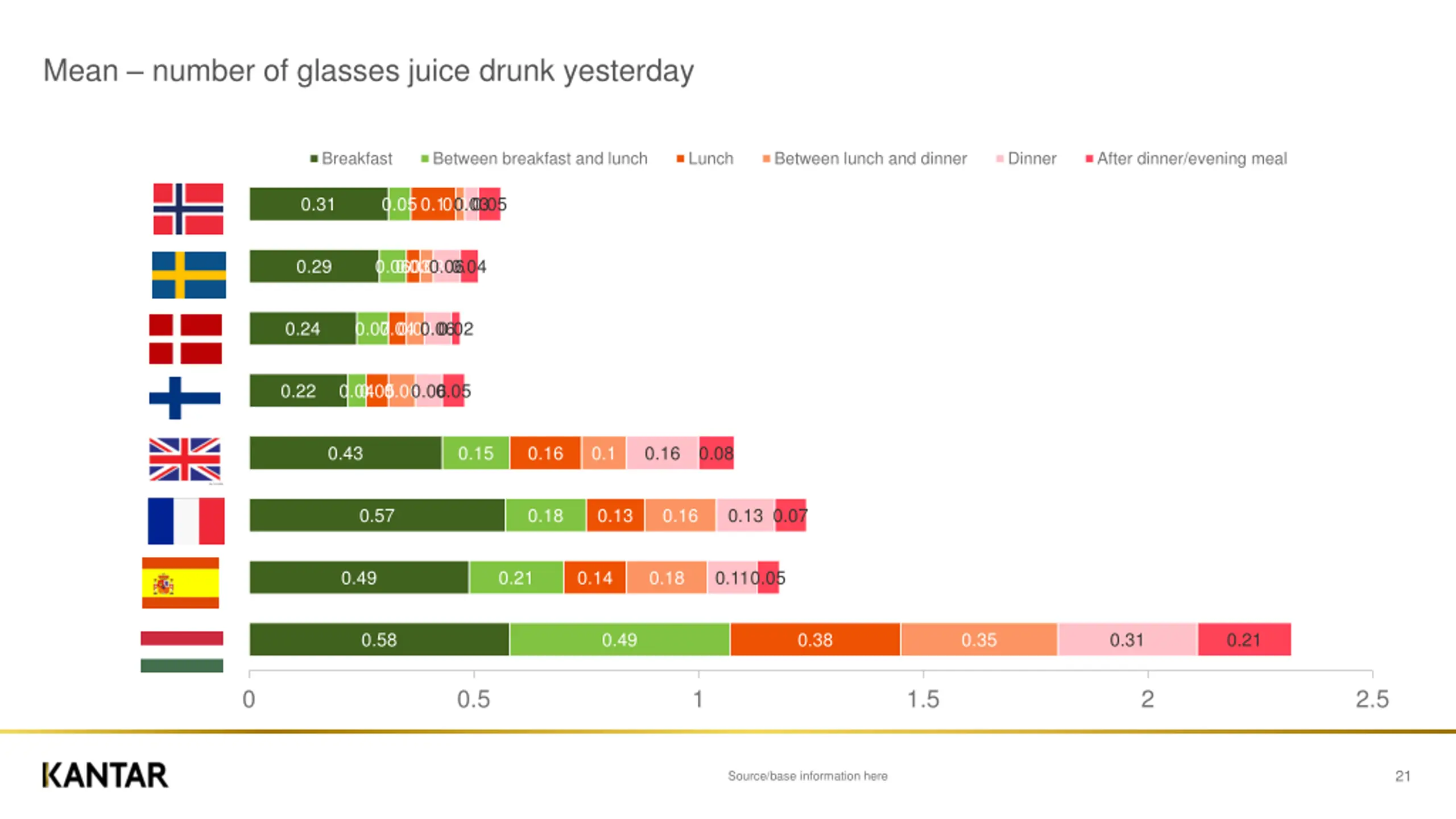 Mean number of glasses juice drunk yesterday Breakfast Between breakfast and lunch Lunch Between lunch and dinner Dinner After dinner/evening meal 0.31 0.05 0.1 0.02 0.03 0.05 0.29 0.06 0.03 0.03 0.06 0.04 0.24 0.07 0.04 0.04 0.06 0.02 0.22 0.04 0.05 0.06 0.06 0.05 0.43 0.15 0.16 0.1 0.16 0.08 0.57 0.18 0.13 0.16 0.13 0.07 0.49 0.21 0.14 0.18 0.11 0.05 0.58 0.49 0.38 0.35 0.31 0.21 0 0.5 1 1.5 2 2.5 21 Source/base information here