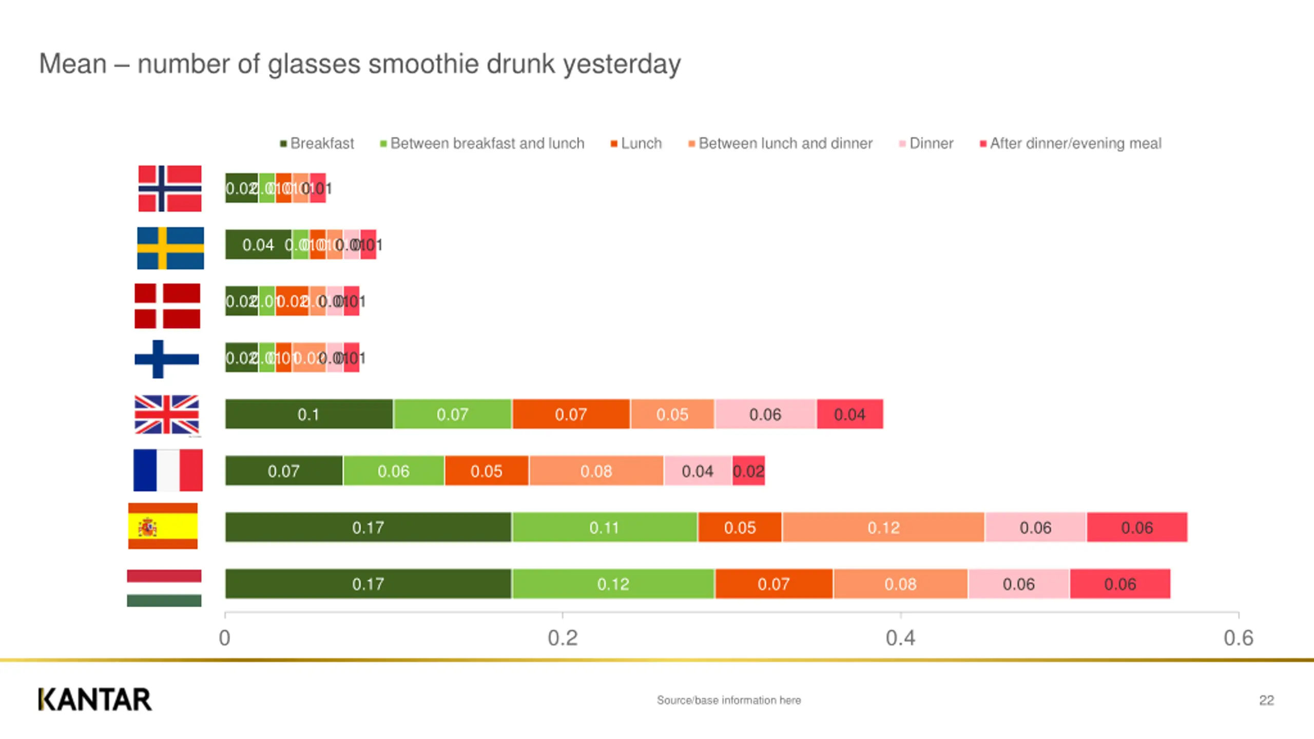 Mean number of glasses smoothie drunk yesterday Breakfast Between breakfast and lunch Lunch Between lunch and dinner Dinner After dinner/evening meal 0.02 0.01 0.01 0.01 0.01 0.04 0.01 0.01 0.01 0.01 0.01 0.02 0.01 0.02 0.01 0.01 0.01 0.02 0.01 0.01 0.02 0.01 0.01 0.1 0.07 0.07 0.05 0.06 0.04 0.07 0.06 0.05 0.08 0.04 0.02 0.17 0.11 0.05 0.12 0.06 0.06 0.17 0.12 0.07 0.08 0.06 0.06 0 0.2 0.4 0.6 22 Source/base information here