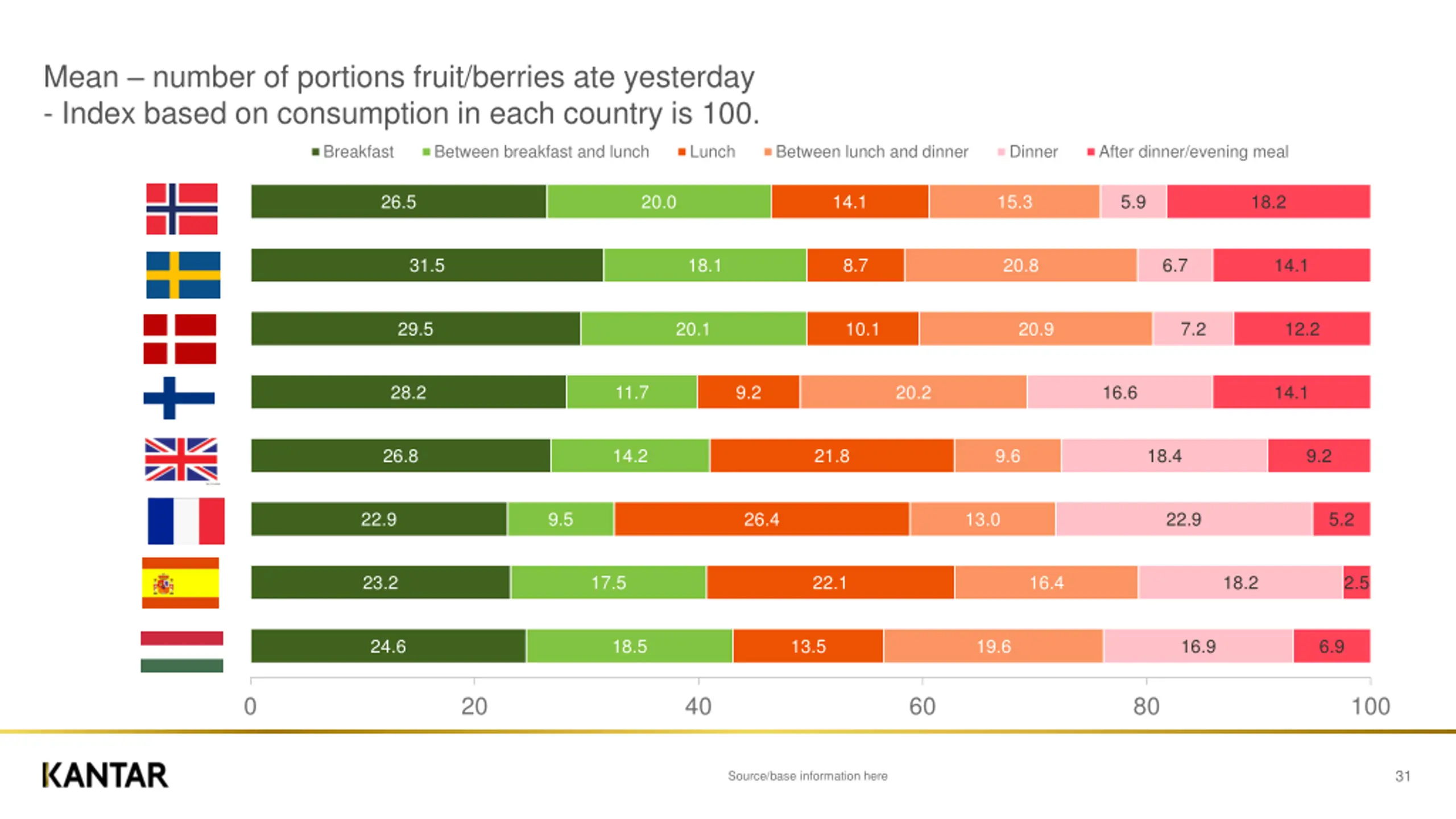 Number of portions fruit/berries and vegetables ate yesterday - Index based on consumption in each country is 100. Breakfast Between breakfast and lunch Lunch Between lunch and dinner Dinner After dinner/evening meal 26.8 11.6 16.1 8.6 26.8 10.0 30.1 11.6 18.8 10.4 21.7 7.4 25.9 12.9 16.4 12.4 26.6 5.8 26.9 8.5 22.6 13.3 19.7 9.0 23.3 11.4 21.3 7.3 30.3 6.3 25.9 10.2 26.1 9.7 24.2 3.9 25.6 15.4 22.9 14.1 18.7 3.3 25.7 17.7 18.4 14.9 16.2 7.1 0 10 20 30 40 50 60 70 80 90 100 30 Source/base information here