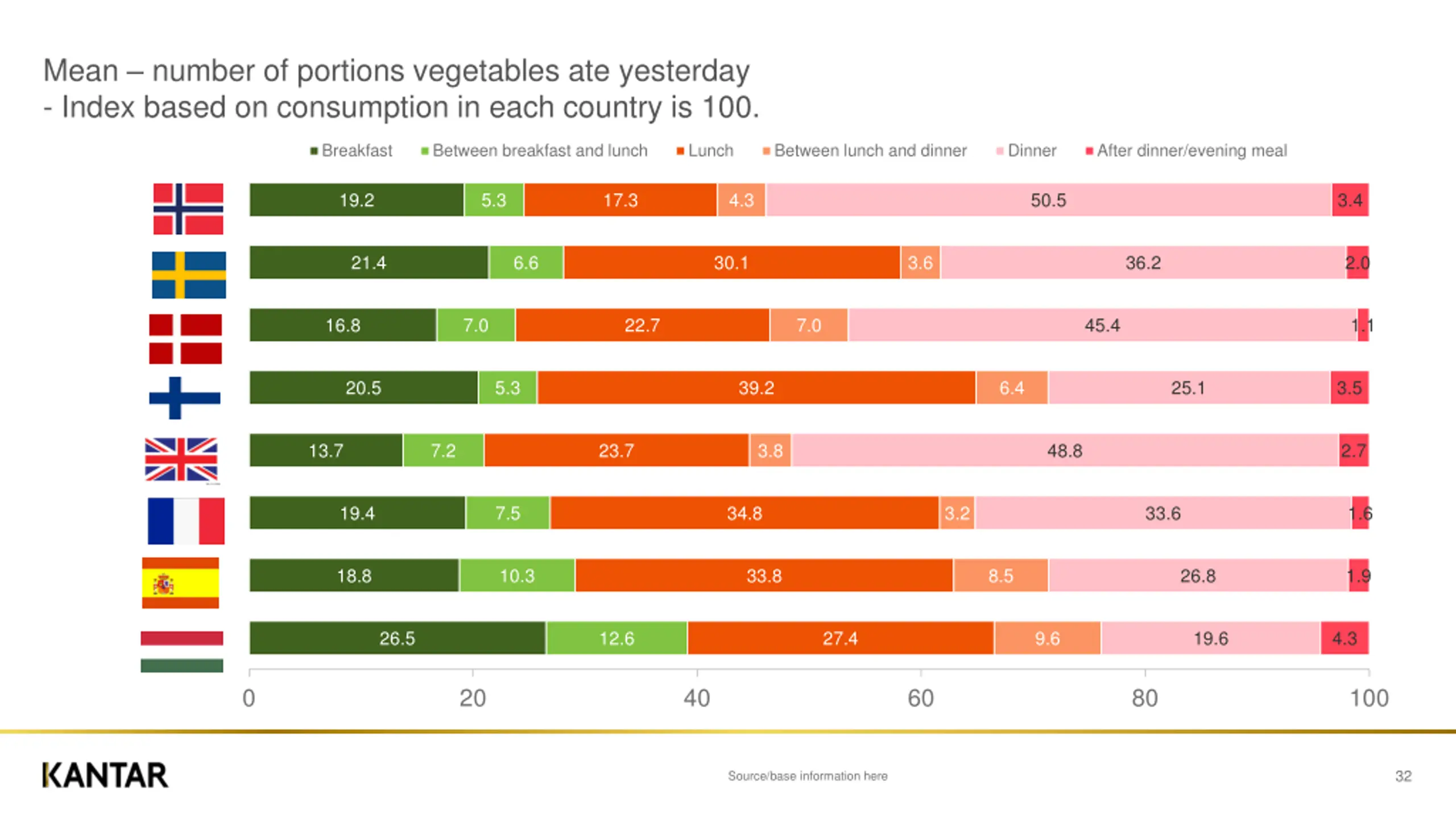 Mean number of portions fruit/berries ate yesterday - Index based on consumption in each country is 100. Breakfast Between breakfast and lunch Lunch Between lunch and dinner Dinner After dinner/evening meal 26.5 20.0 14.1 15.3 5.9 18.2 31.5 18.1 8.7 20.8 6.7 14.1 29.5 20.1 10.1 20.9 7.2 12.2 28.2 11.7 9.2 20.2 16.6 14.1 26.8 14.2 21.8 9.6 18.4 9.2 22.9 9.5 26.4 13.0 22.9 5.2 23.2 17.5 22.1 16.4 18.2 2.5 24.6 18.5 13.5 19.6 16.9 6.9 0 20 40 60 80 100 31 Source/base information here