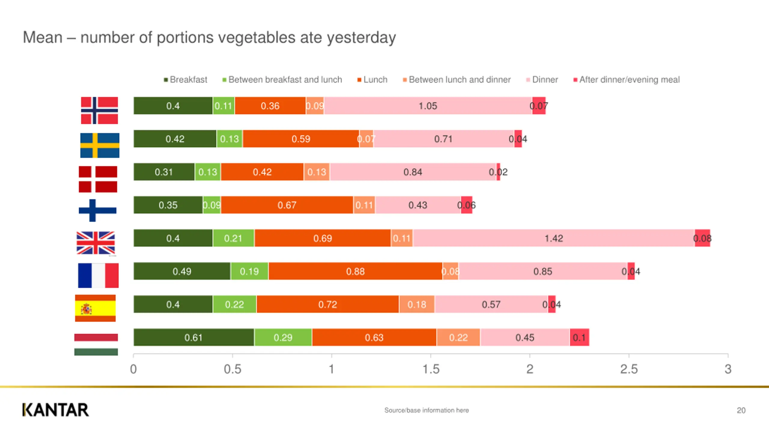 Mean number of portions vegetables ate yesterday Breakfast Between breakfast and lunch Lunch Between lunch and dinner Dinner After dinner/evening meal 0.4 0.11 0.36 0.09 1.05 0.07 0.42 0.13 0.59 0.07 0.71 0.04 0.31 0.13 0.42 0.13 0.84 0.02 0.35 0.09 0.67 0.11 0.43 0.06 0.4 0.21 0.69 0.11 1.42 0.08 0.49 0.19 0.88 0.08 0.85 0.04 0.4 0.22 0.72 0.18 0.57 0.04 0.61 0.29 0.63 0.22 0.45 0.1 0 0.5 1 1.5 2 2.5 3 20 Source/base information here