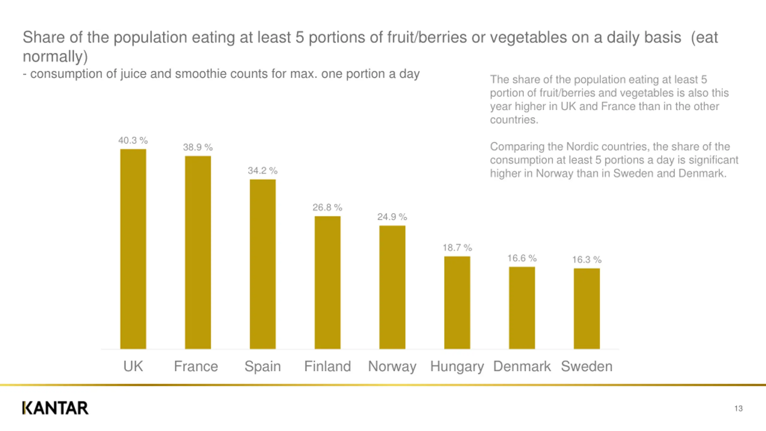 Share of the population eating at least 5 portions of fruit/berries or vegetables on a daily basis (eat normally) - consumption of juice and smoothie counts for max. one portion a day The share of the population eating at least 5 portion of fruit/berries and vegetables is also this year higher in UK and France than in the other countries. 40.3 % Comparing the Nordic countries, the share of the consumption at least 5 portions a day is significant higher in Norway than in Sweden and Denmark. 38.9 % 34.2 % 26.8 % 24.9 % 18.7 % 16.6 % 16.3 % UK France Spain Finland Norway Hungary Denmark Sweden 13