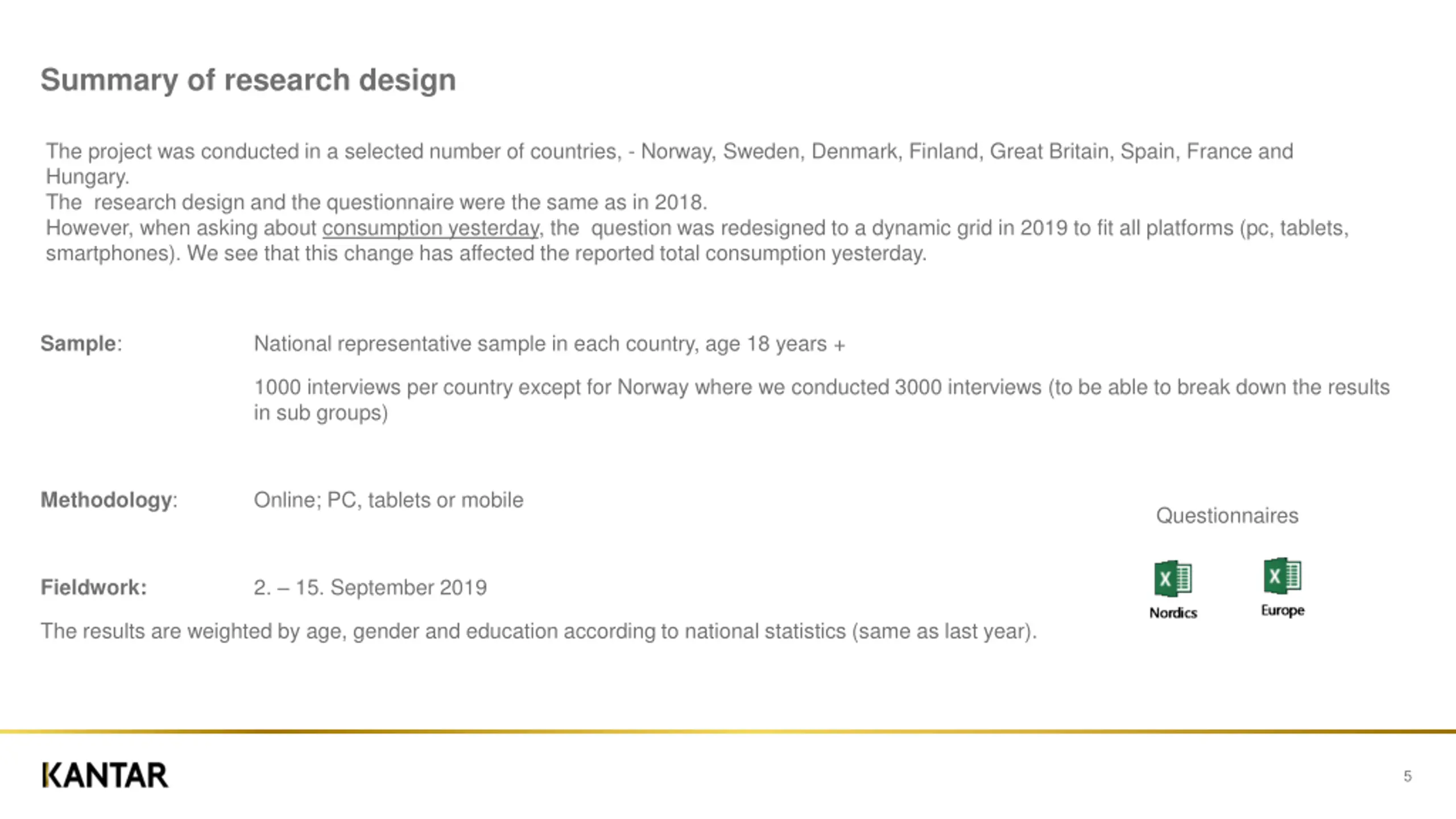 Summary of research design The project was conducted in a selected number of countries, - Norway, Sweden, Denmark, Finland, Great Britain, Spain, France and Hungary. The research design and the questionnaire were the same as in 2018. However, when asking about consumption yesterday, the question was redesigned to a dynamic grid in 2019 to fit all platforms (pc, tablets, smartphones). We see that this change has affected the reported total consumption yesterday. Sample: National representative sample in each country, age 18 years + 1000 interviews per country except for Norway where we conducted 3000 interviews (to be able to break down the results in sub groups) Methodology: Online; PC, tablets or mobile Questionnaires 2. 15. September 2019 Fieldwork: The results are weighted by age, gender and education according to national statistics (same as last year). 5