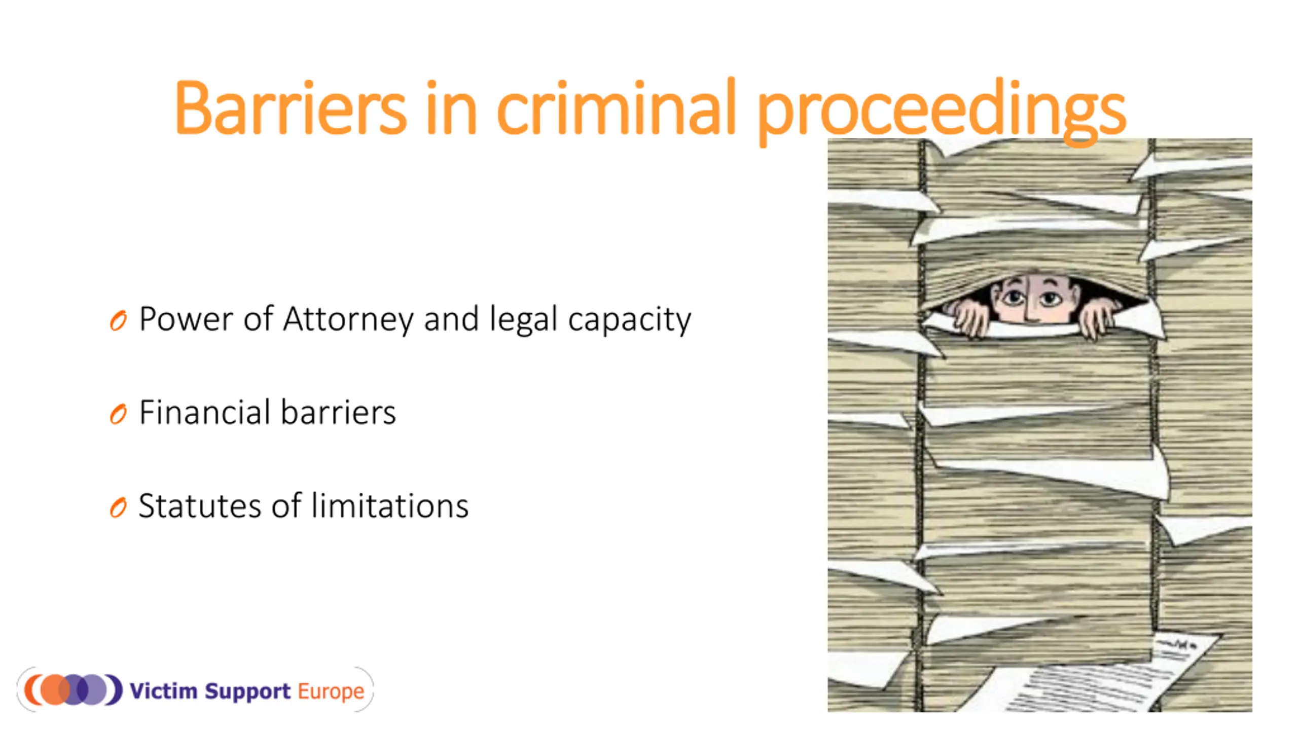Barriers in criminal proceedings Barriers in criminal proceedings O Power of Attorney and legal capacity O Financial barriers O Statutes of limitations