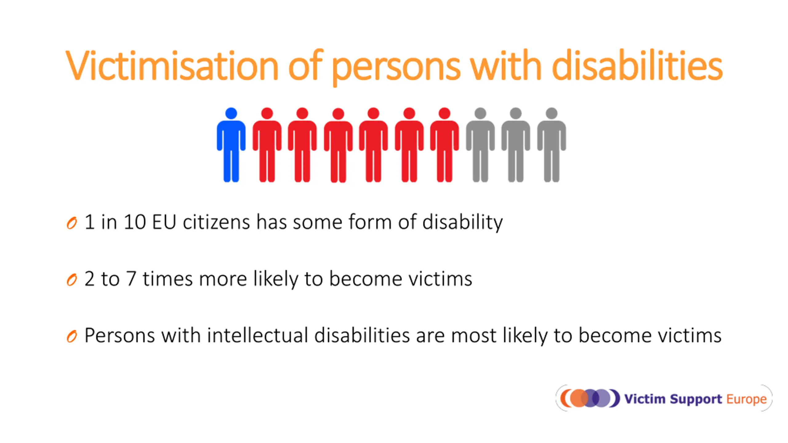 Victimisation of persons with disabilities Victimisation of persons with disabilities O 1 in 10 EU citizens has some form of disability O 2 to 7 times more likely to become victims O Persons with intellectual disabilities are most likely to become victims
