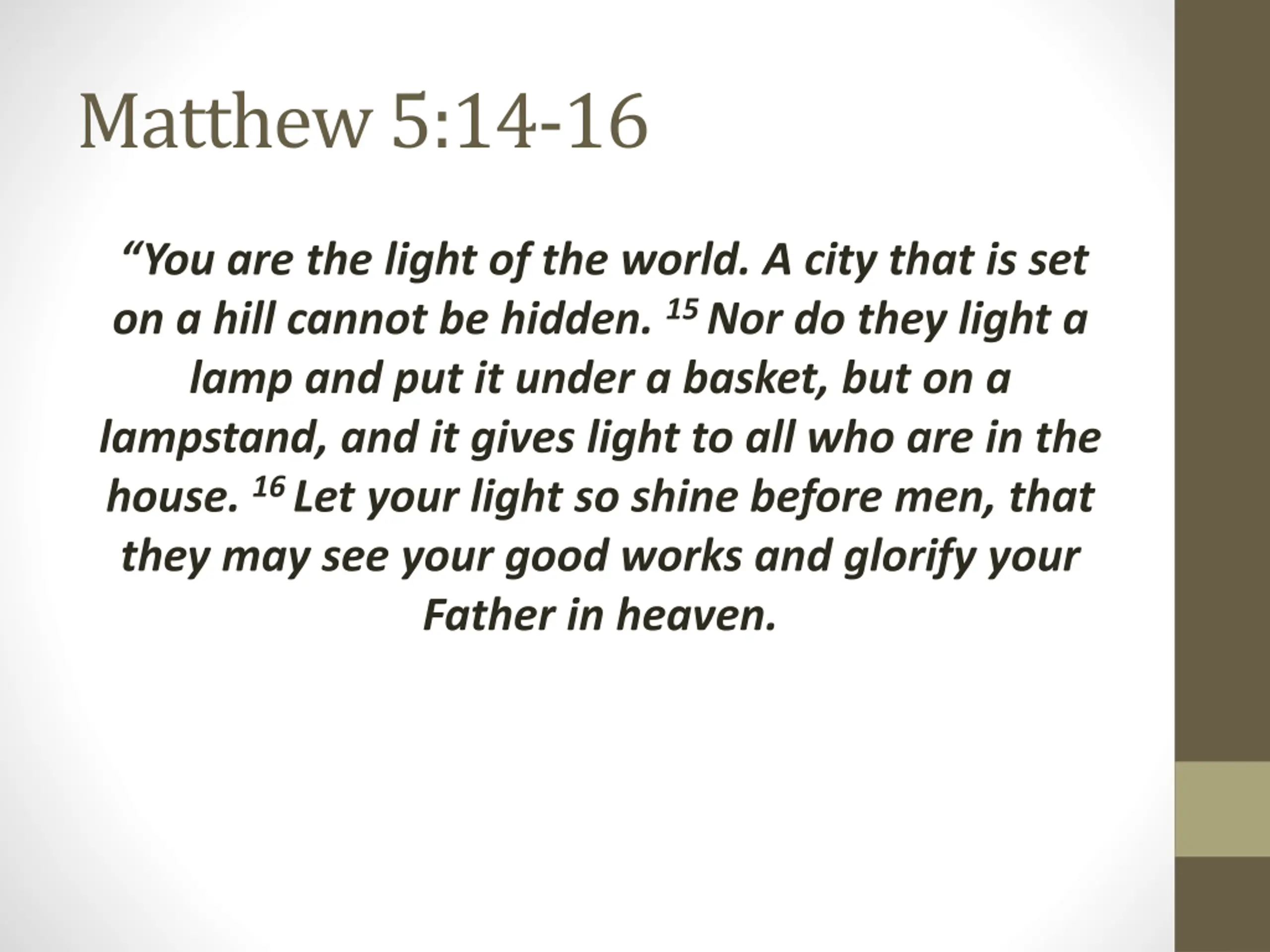 Matthew 5:14-16 You are the light of the world. A city that is set on a hill cannot be hidden.15Nor do they light a lamp and put it under a basket, but on a lampstand, and it gives light to all who are in the house.16Let your light so shine before men, that they may see your good works and glorify your Father in heaven.