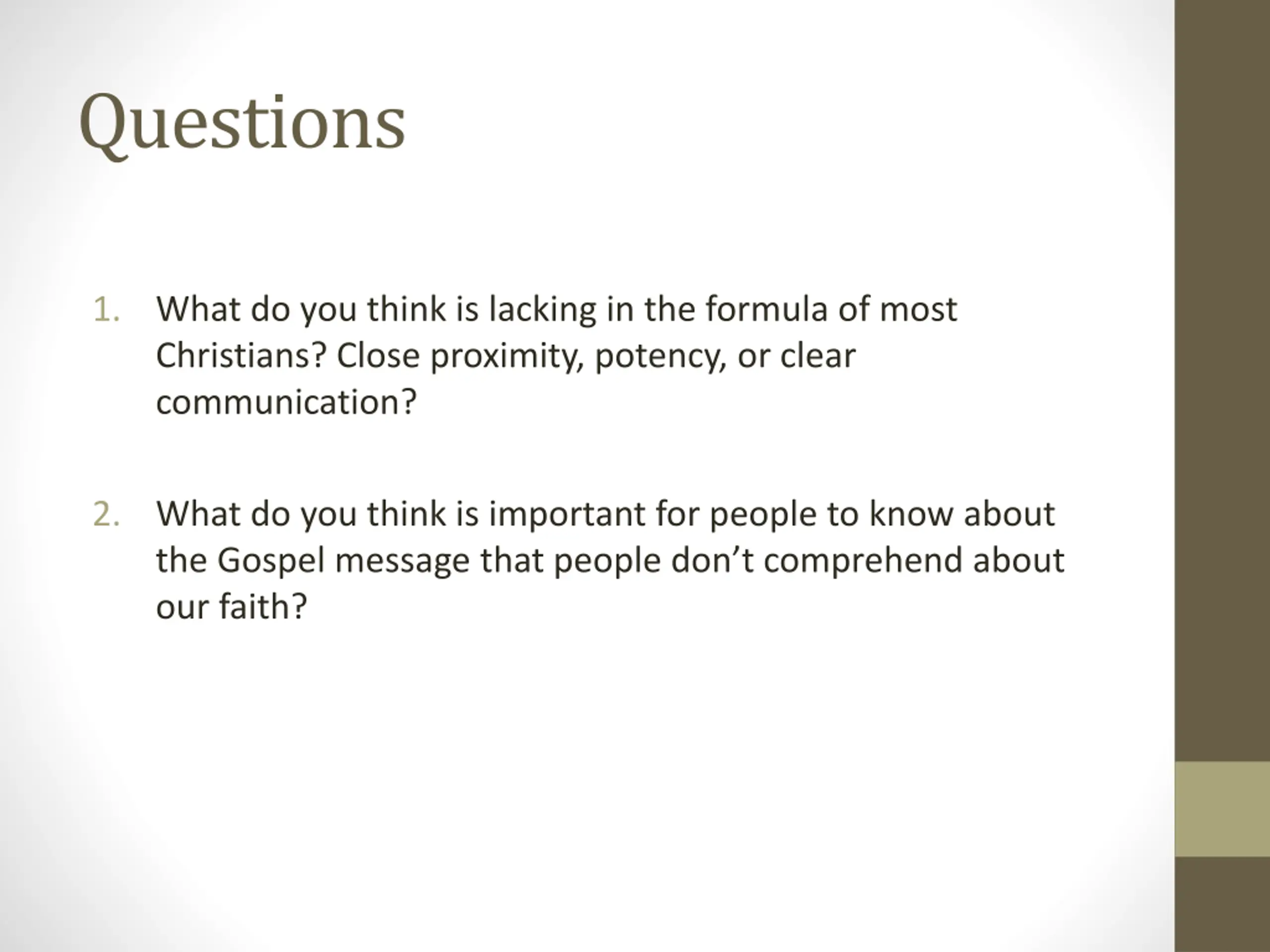 Questions 1. What do you think is lacking in the formula of most Christians? Close proximity, potency, or clear communication? 2. What do you think is important for people to know about the Gospel message that people don t comprehend about our faith?