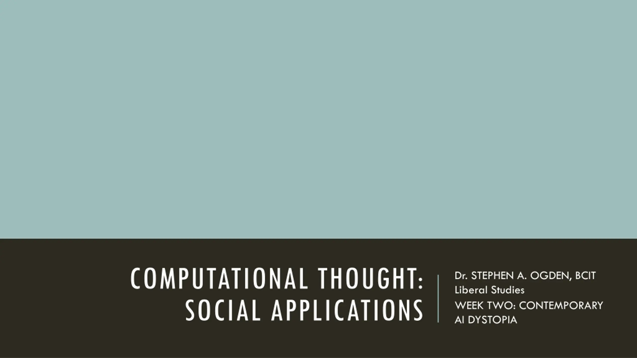 COMPUTATIONAL THOUGHT: SOCIAL APPLICATIONS Dr. STEPHEN A. OGDEN, BCIT Liberal Studies WEEK TWO: CONTEMPORARY AI DYSTOPIA
