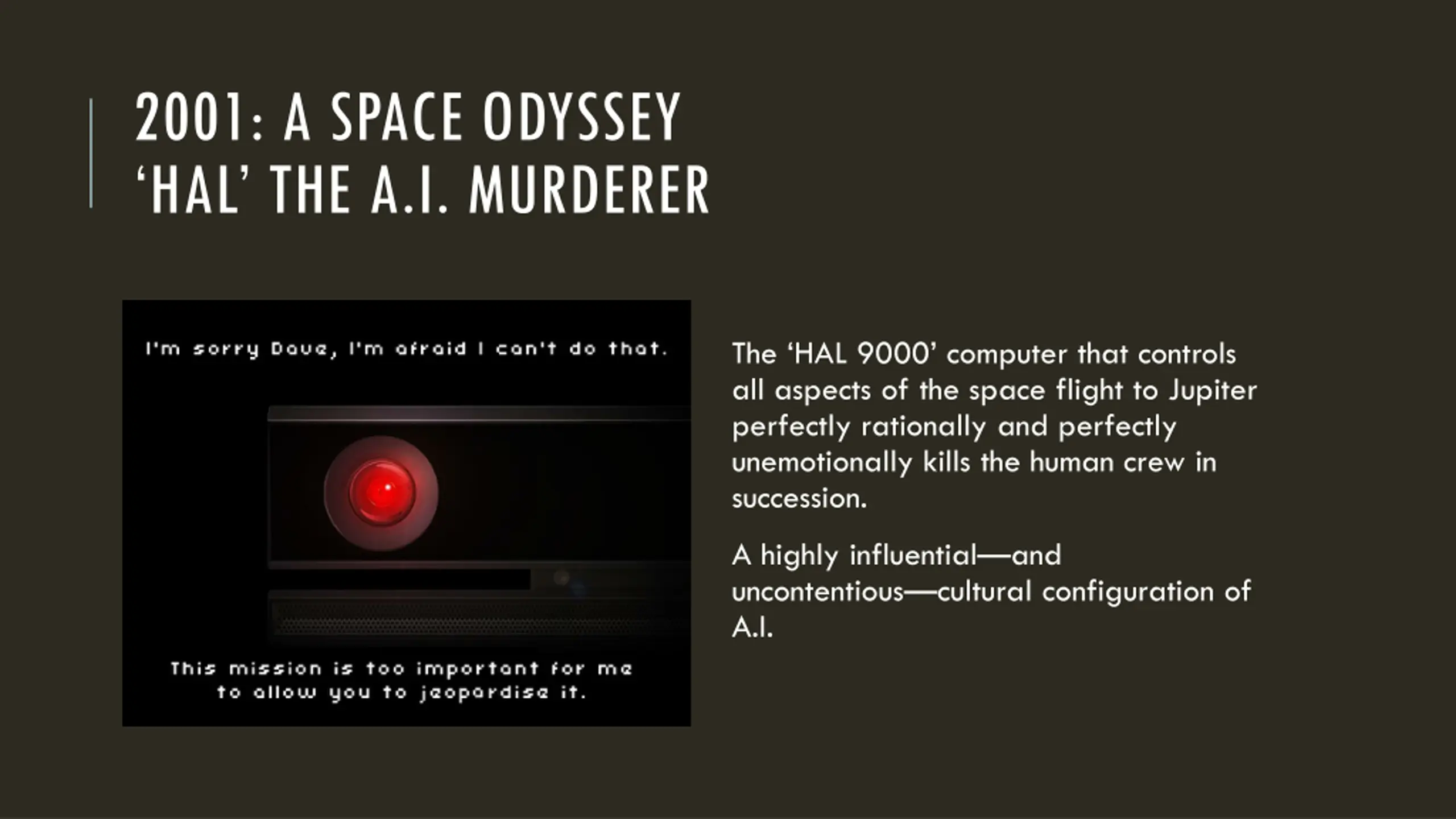 2001: A SPACE ODYSSEY HAL THE A.I. MURDERER The HAL 9000 computer that controls all aspects of the space flight to Jupiter perfectly rationally and perfectly unemotionally kills the human crew in succession. A highly influential and uncontentious cultural configuration of A.I.