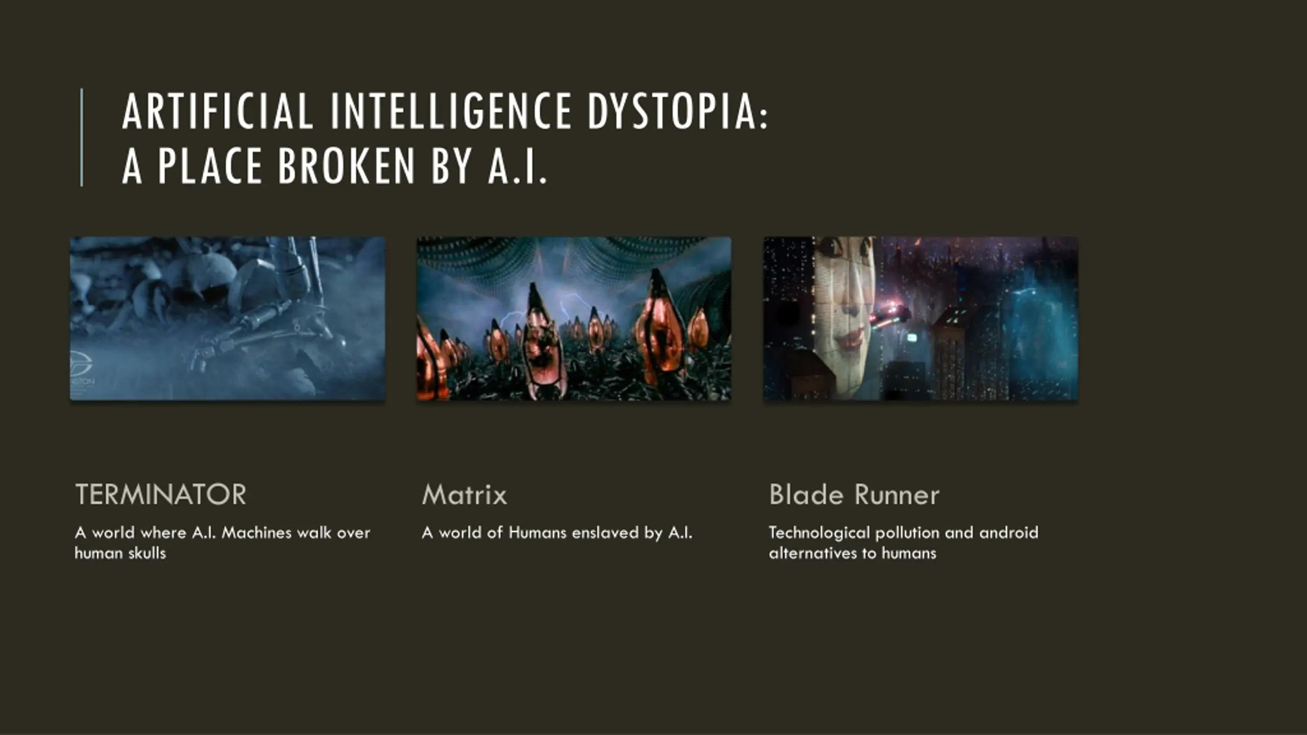 ARTIFICIAL INTELLIGENCE DYSTOPIA: A PLACE BROKEN BY A.I. TERMINATOR Matrix Blade Runner A world where A.I. Machines walk over human skulls A world of Humans enslaved by A.I. Technological pollution and android alternatives to humans