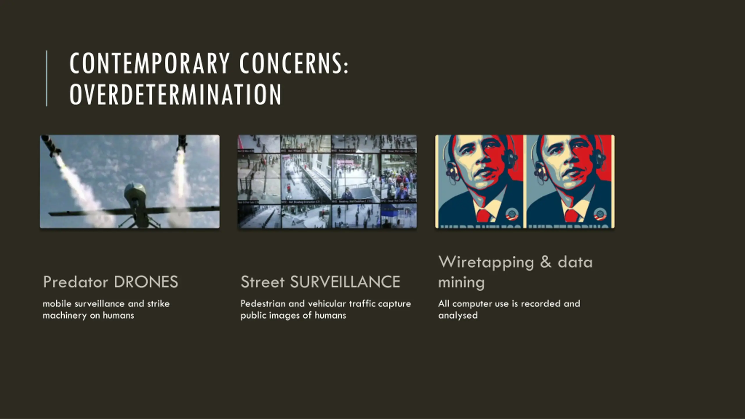 CONTEMPORARY CONCERNS: OVERDETERMINATION Wiretapping & data mining Predator DRONES Street SURVEILLANCE mobile surveillance and strike machinery on humans Pedestrian and vehicular traffic capture public images of humans All computer use is recorded and analysed