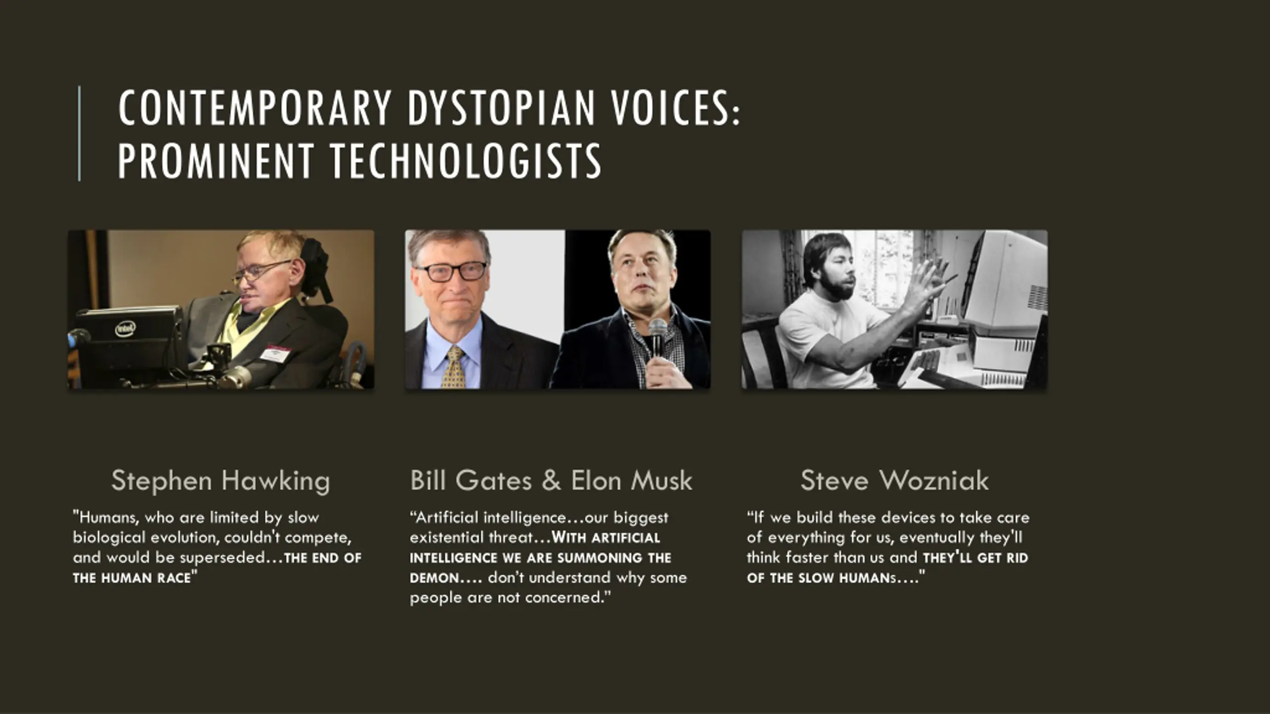 CONTEMPORARY DYSTOPIAN VOICES: PROMINENT TECHNOLOGISTS Stephen Hawking Bill Gates & Elon Musk Steve Wozniak "Humans, who are limited by slow biological evolution, couldn't compete, and would be superseded THE END OF THE HUMAN RACE" Artificial intelligence our biggest existential threat WITH ARTIFICIAL INTELLIGENCE WE ARE SUMMONING THE DEMON . don t understand why some people are not concerned. If we build these devices to take care of everything for us, eventually they'll think faster than us and THEY'LL GET RID OF THE SLOW HUMANs ."