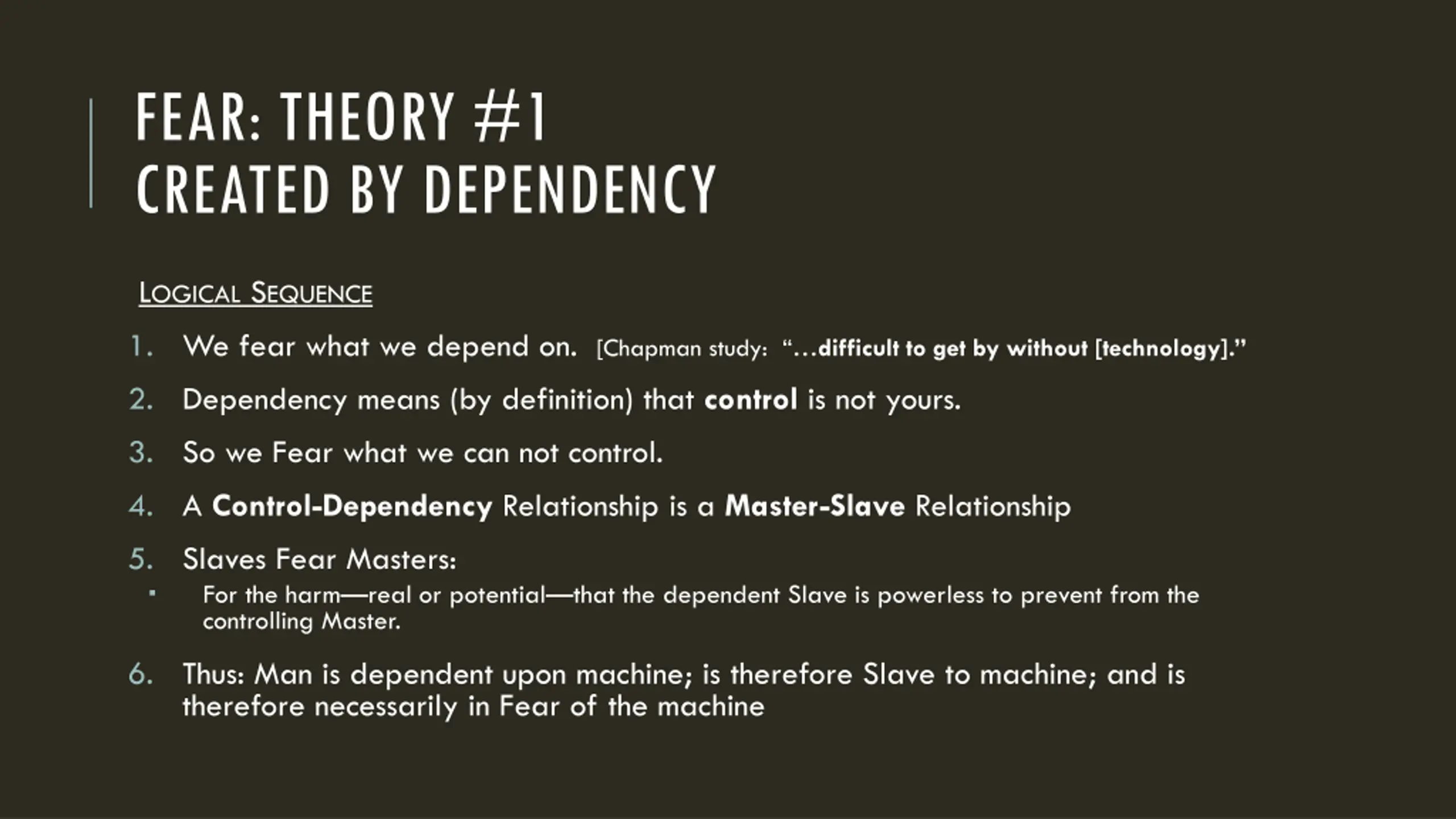 FEAR: THEORY #1 CREATED BY DEPENDENCY LOGICAL SEQUENCE 1. We fear what we depend on. [Chapman study: difficult to get by without [technology]. 2. Dependency means (by definition) that control is not yours. 3. So we Fear what we can not control. 4. A Control-Dependency Relationship is a Master-Slave Relationship 5. Slaves Fear Masters: For the harm real or potential that the dependent Slave is powerless to prevent from the controlling Master. 6. Thus: Man is dependent upon machine; is therefore Slave to machine; and is therefore necessarily in Fear of the machine