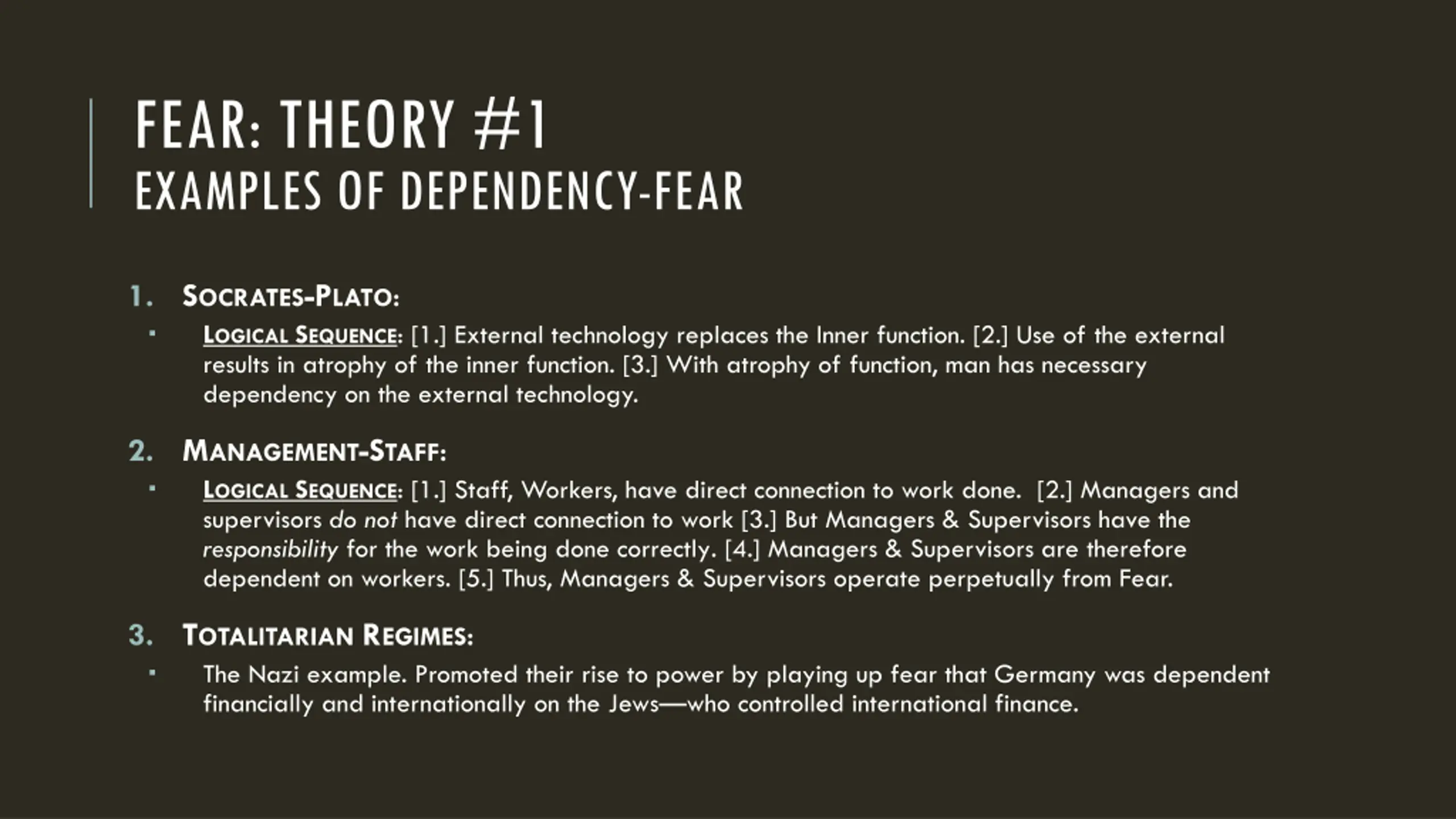 FEAR: THEORY #1 EXAMPLES OF DEPENDENCY-FEAR 1. SOCRATES-PLATO: LOGICAL SEQUENCE: [1.] External technology replaces the Inner function. [2.] Use of the external results in atrophy of the inner function. [3.] With atrophy of function, man has necessary dependency on the external technology. 2. MANAGEMENT-STAFF: LOGICAL SEQUENCE: [1.] Staff, Workers, have direct connection to work done. [2.] Managers and supervisors do not have direct connection to work [3.] But Managers & Supervisors have the responsibility for the work being done correctly. [4.] Managers & Supervisors are therefore dependent on workers. [5.] Thus, Managers & Supervisors operate perpetually from Fear. 3. TOTALITARIAN REGIMES: The Nazi example. Promoted their rise to power by playing up fear that Germany was dependent financially and internationally on the Jews who controlled international finance.