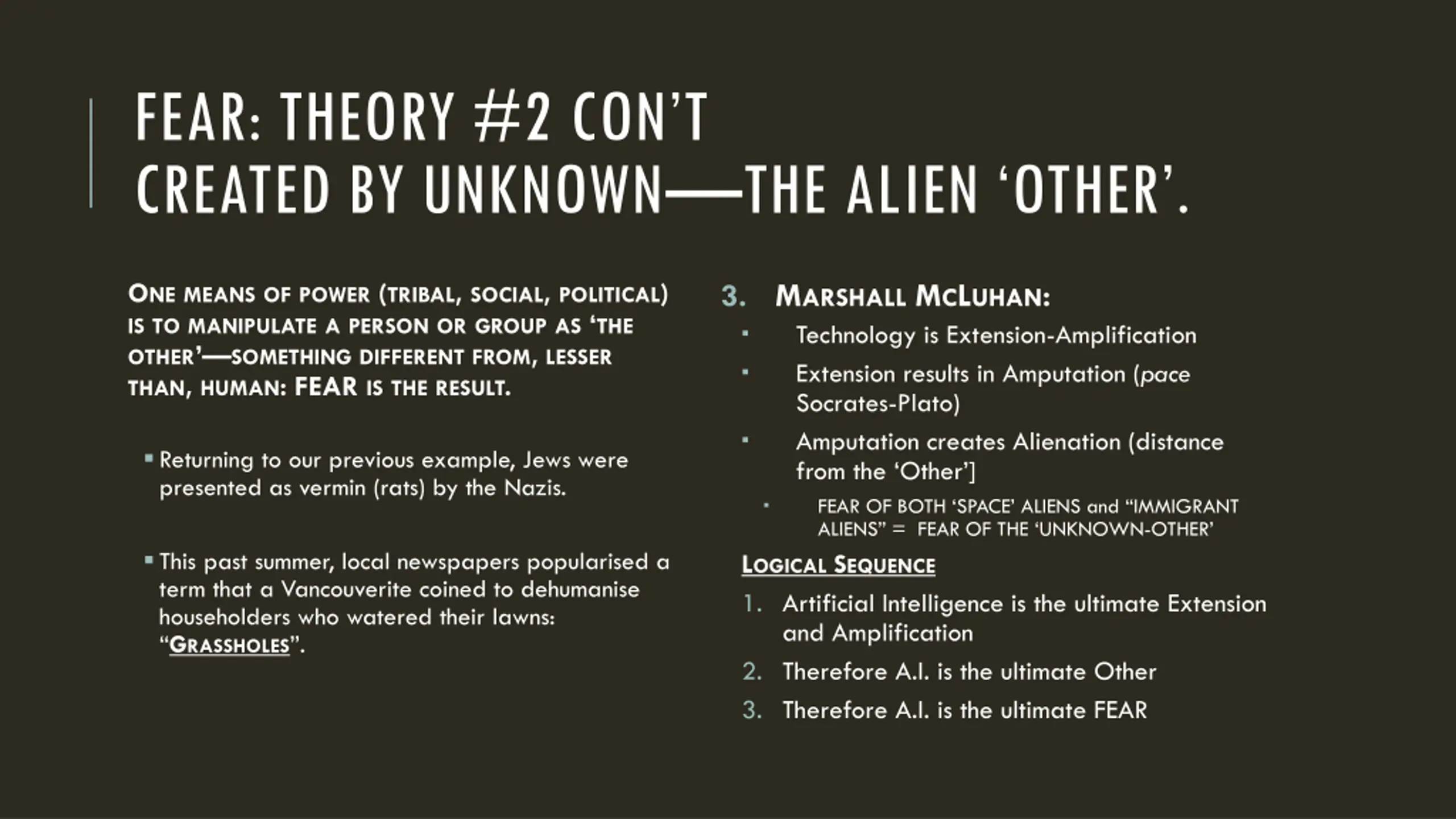 FEAR: THEORY #2 CONT CREATED BY UNKNOWN THE ALIEN OTHER . 3. MARSHALL MCLUHAN: Technology is Extension-Amplification Extension results in Amputation (pace Socrates-Plato) Amputation creates Alienation (distance from the Other ] FEAR OF BOTH SPACE ALIENS and IMMIGRANT ALIENS = FEAR OF THE UNKNOWN-OTHER LOGICAL SEQUENCE 1. Artificial Intelligence is the ultimate Extension and Amplification 2. Therefore A.I. is the ultimate Other 3. Therefore A.I. is the ultimate FEAR ONE MEANS OF POWER (TRIBAL, SOCIAL, POLITICAL) IS TO MANIPULATE A PERSON OR GROUP AS THE OTHER SOMETHING DIFFERENT FROM, LESSER THAN, HUMAN: FEAR IS THE RESULT. Returning to our previous example, Jews were presented as vermin (rats) by the Nazis. This past summer, local newspapers popularised a term that a Vancouverite coined to dehumanise householders who watered their lawns: GRASSHOLES .