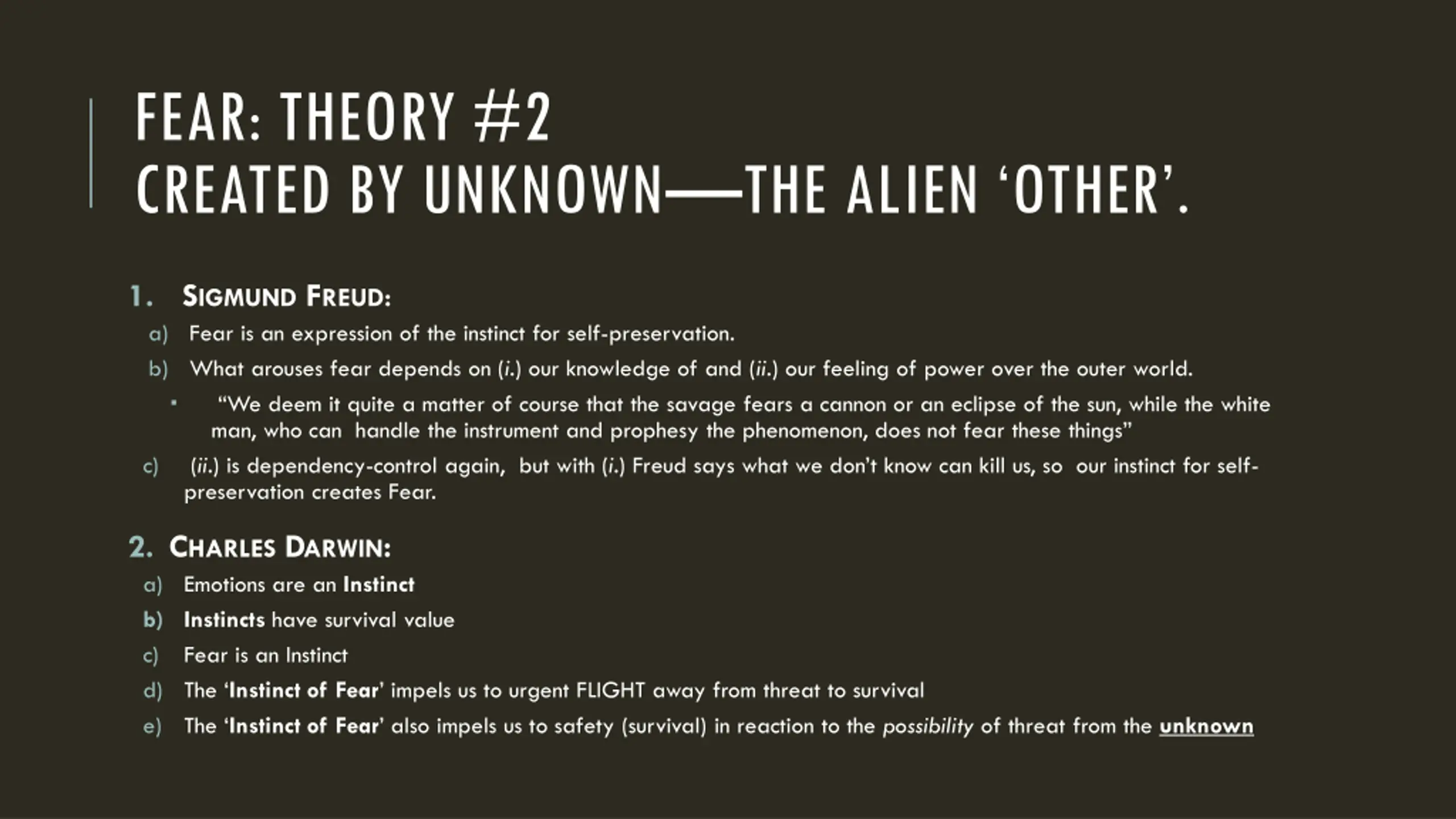 FEAR: THEORY #2 CREATED BY UNKNOWN THE ALIEN OTHER . 1. SIGMUND FREUD: a) Fear is an expression of the instinct for self-preservation. b) What arouses fear depends on (i.) our knowledge of and (ii.) our feeling of power over the outer world. We deem it quite a matter of course that the savage fears a cannon or an eclipse of the sun, while the white man, who can handle the instrument and prophesy the phenomenon, does not fear these things c) (ii.) is dependency-control again, but with (i.) Freud says what we don t know can kill us, so our instinct for self- preservation creates Fear. 2. CHARLES DARWIN: a) Emotions are an Instinct b) Instincts have survival value c) Fear is an Instinct d) The Instinct of Fear impels us to urgent FLIGHT away from threat to survival e) The Instinct of Fear also impels us to safety (survival) in reaction to the possibility of threat from the unknown