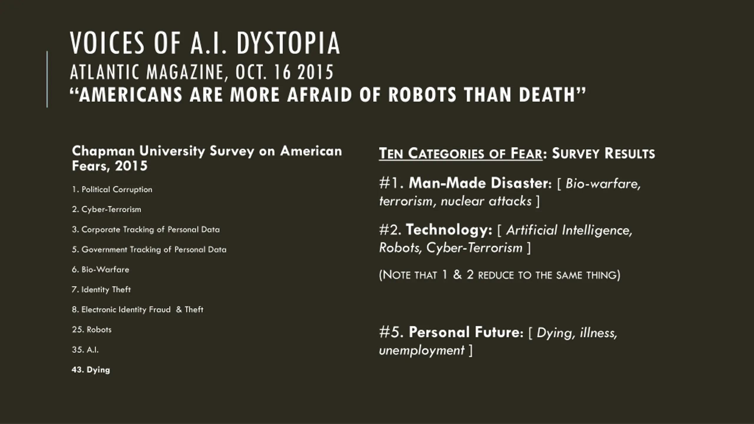 VOICES OF A.I. DYSTOPIA ATLANTIC MAGAZINE, OCT. 16 2015 AMERICANS ARE MORE AFRAID OF ROBOTS THAN DEATH Chapman University Survey on American Fears, 2015 TEN CATEGORIES OF FEAR: SURVEY RESULTS #1. Man-Made Disaster: [ Bio-warfare, terrorism, nuclear attacks ] 1. Political Corruption 2. Cyber-Terrorism #2. Technology: [ Artificial Intelligence, Robots, Cyber-Terrorism ] 3. Corporate Tracking of Personal Data 5. Government Tracking of Personal Data 6. Bio-Warfare (NOTE THAT 1 & 2 REDUCE TO THE SAME THING) 7. Identity Theft 8. Electronic Identity Fraud & Theft #5. Personal Future: [ Dying, illness, unemployment ] 25. Robots 35. A.I. 43. Dying