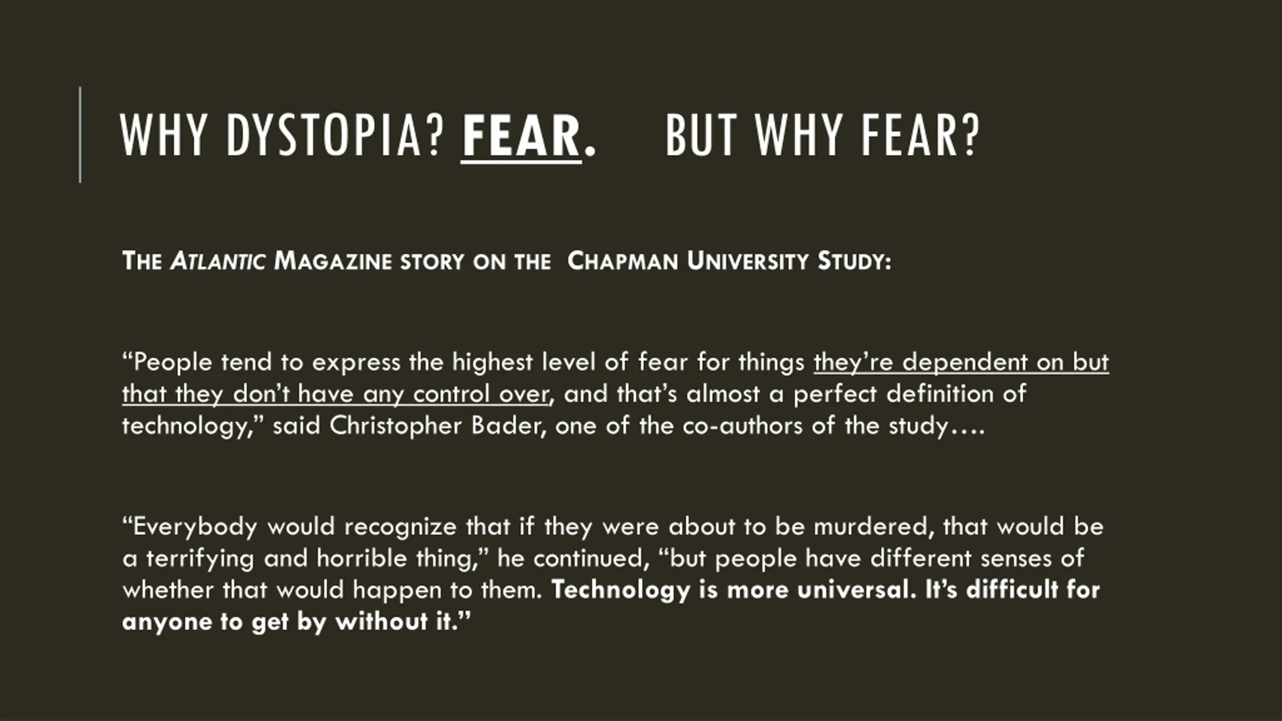 WHY DYSTOPIA? FEAR. BUT WHY FEAR? THE ATLANTIC MAGAZINE STORY ON THE CHAPMAN UNIVERSITY STUDY: People tend to express the highest level of fear for things they re dependent on but that they don t have any control over, and that s almost a perfect definition of technology, said Christopher Bader, one of the co-authors of the study . Everybody would recognize that if they were about to be murdered, that would be a terrifying and horrible thing, he continued, but people have different senses of whether that would happen to them. Technology is more universal. It s difficult for anyone to get by without it.