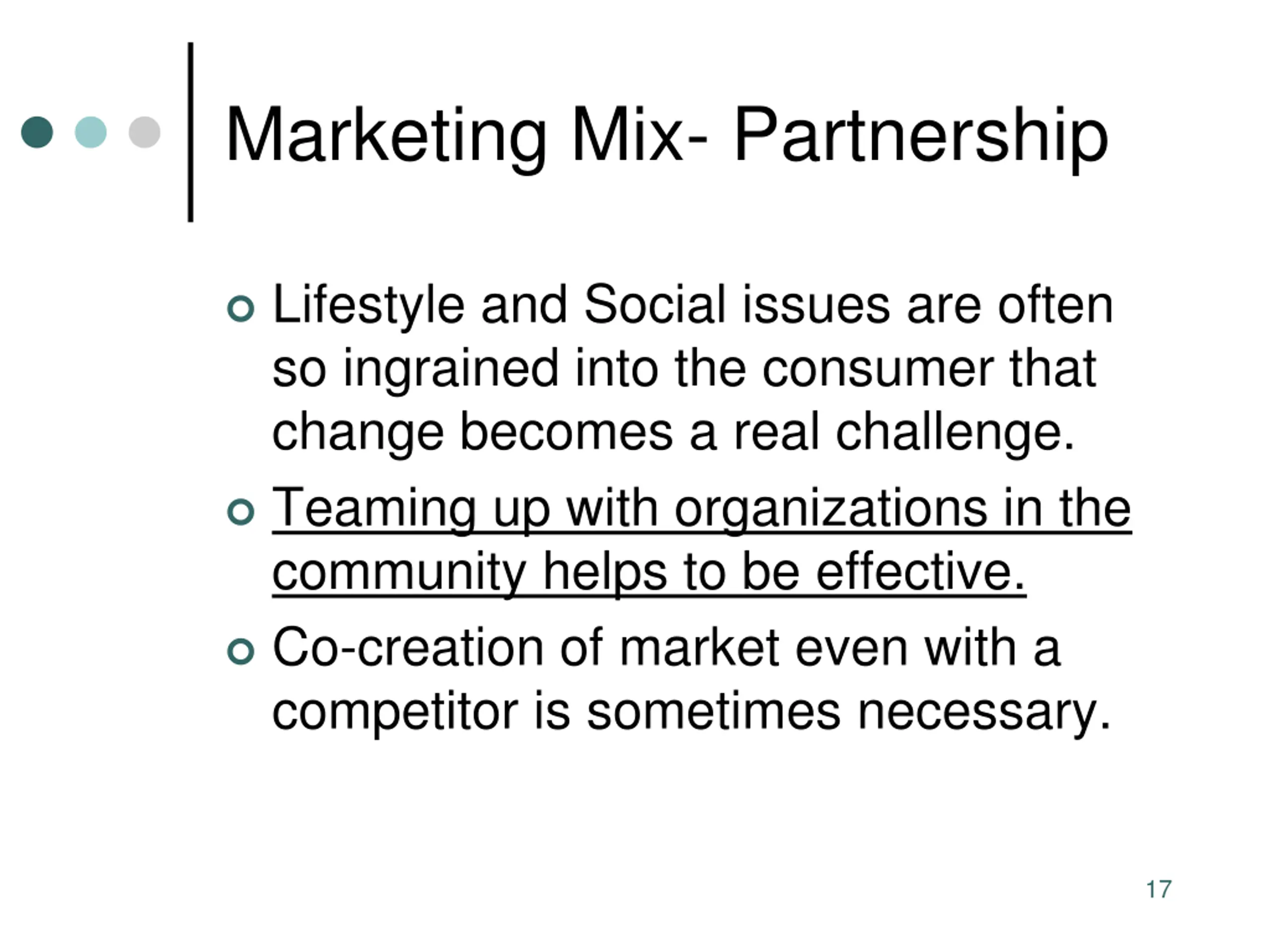 Marketing Mix- Partnership Lifestyle and Social issues are often so ingrained into the consumer that change becomes a real challenge. Teaming up with organizations in the community helps to be effective. Co-creation of market even with a competitor is sometimes necessary. 17