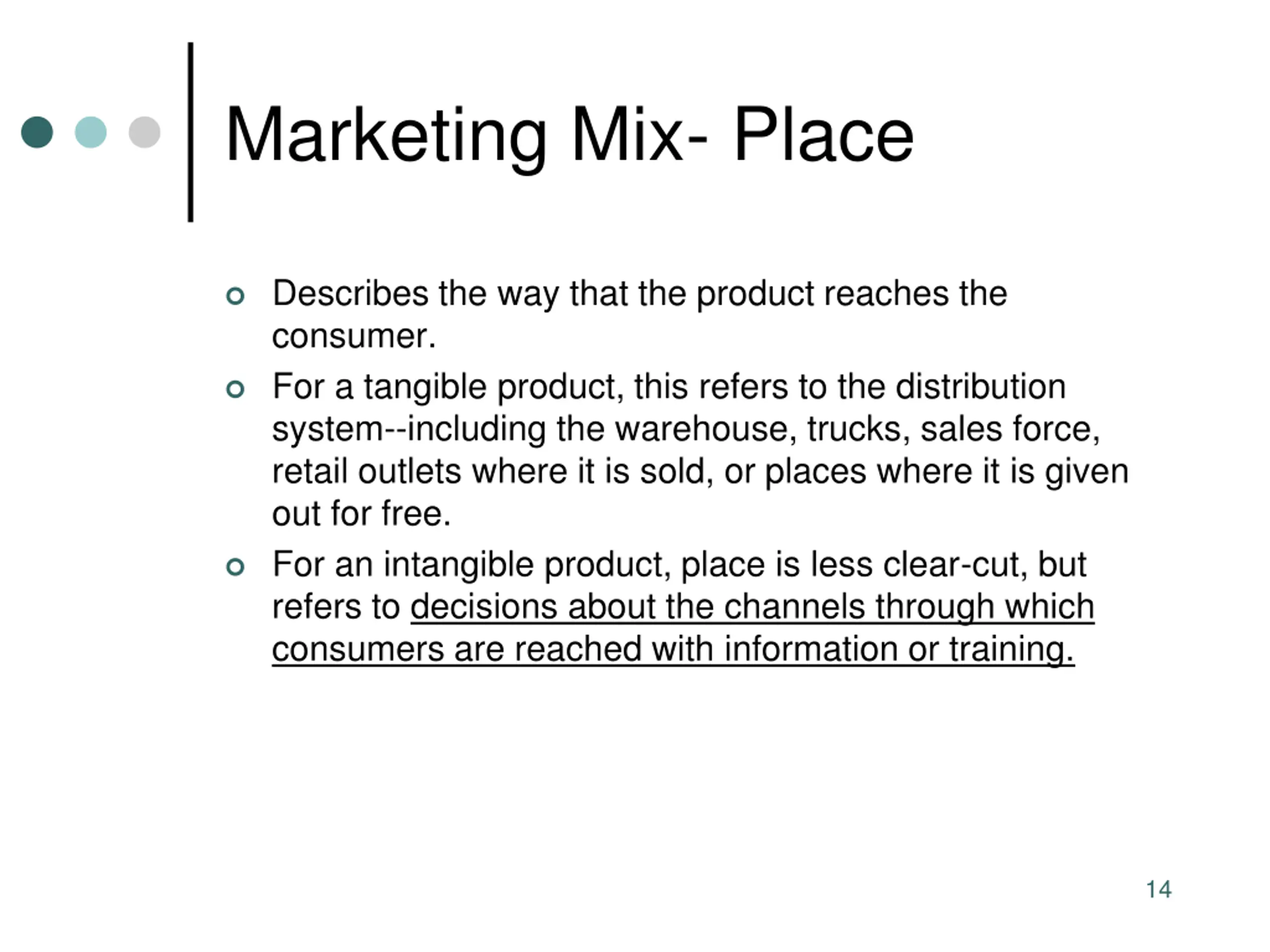 Marketing Mix- Place Describes the way that the product reaches the consumer. For a tangible product, this refers to the distribution system--including the warehouse, trucks, sales force, retail outlets where it is sold, or places where it is given out for free. For an intangible product, place is less clear-cut, but refers to decisions about the channels through which consumers are reached with information or training. 14