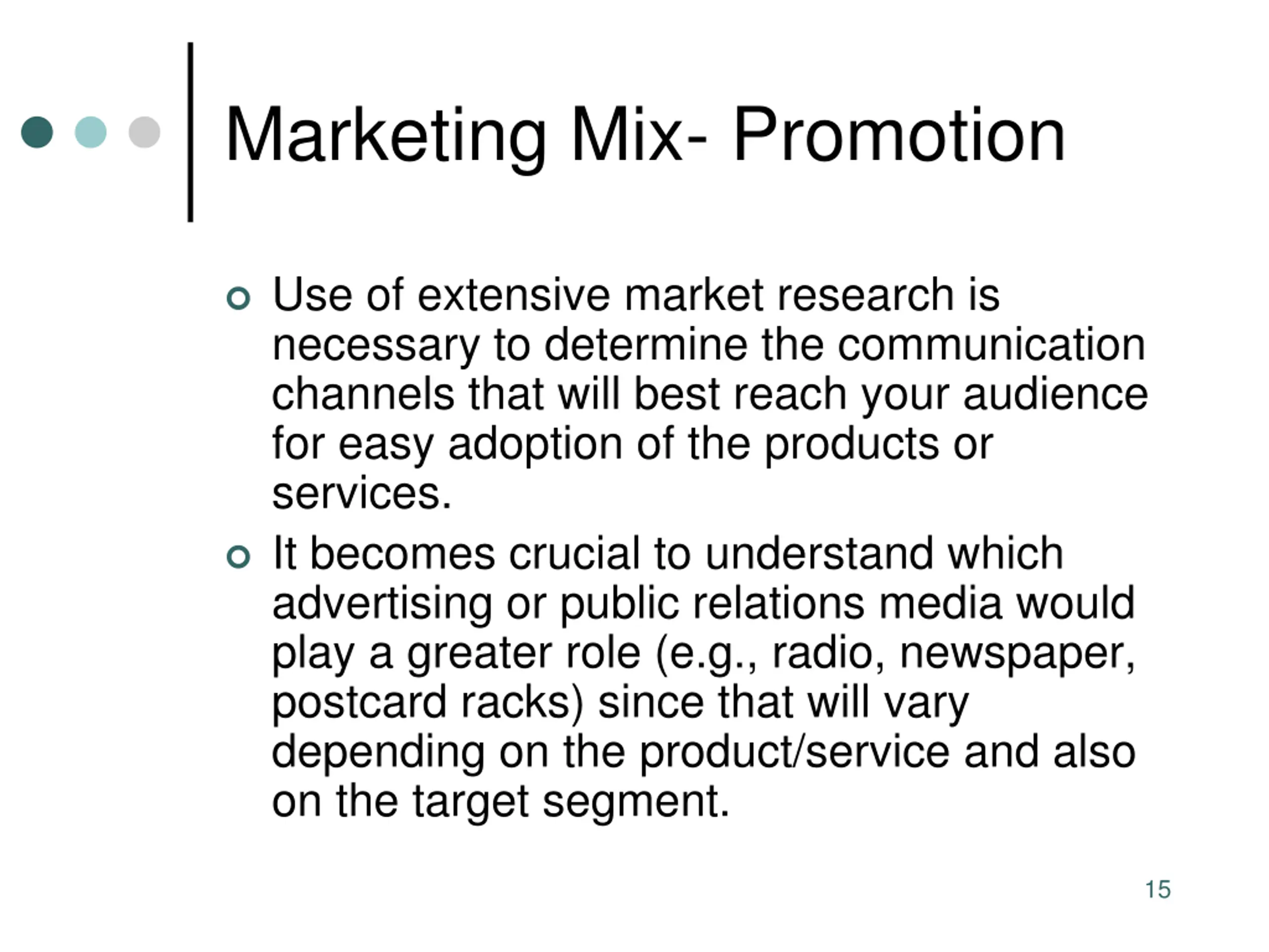 Marketing Mix- Promotion Use of extensive market research is necessary to determine the communication channels that will best reach your audience for easy adoption of the products or services. It becomes crucial to understand which advertising or public relations media would play a greater role (e.g., radio, newspaper, postcard racks) since that will vary depending on the product/service and also on the target segment. 15