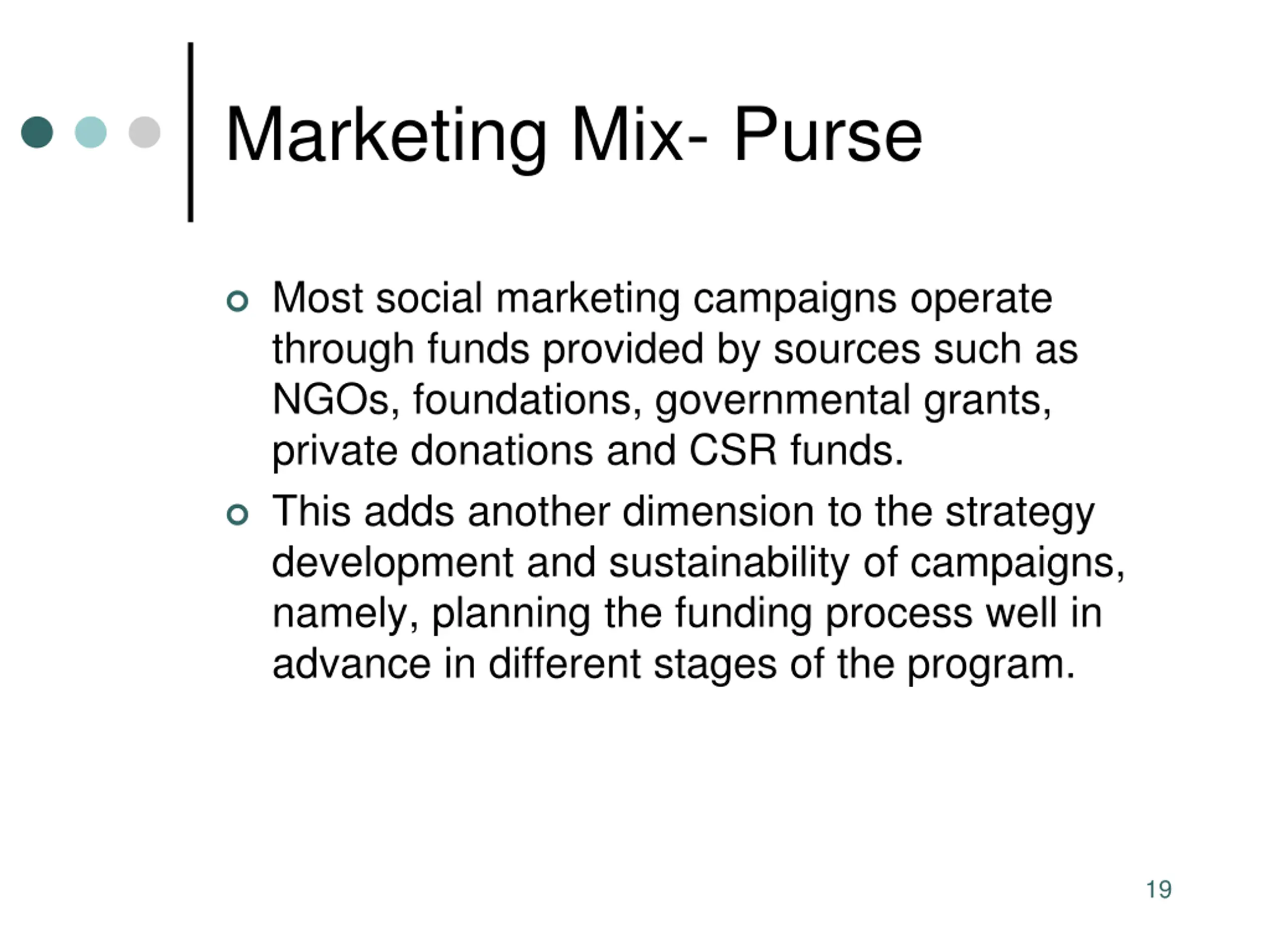 Marketing Mix- Purse Most social marketing campaigns operate through funds provided by sources such as NGOs, foundations, governmental grants, private donations and CSR funds. This adds another dimension to the strategy development and sustainability of campaigns, namely, planning the funding process well in advance in different stages of the program. 19