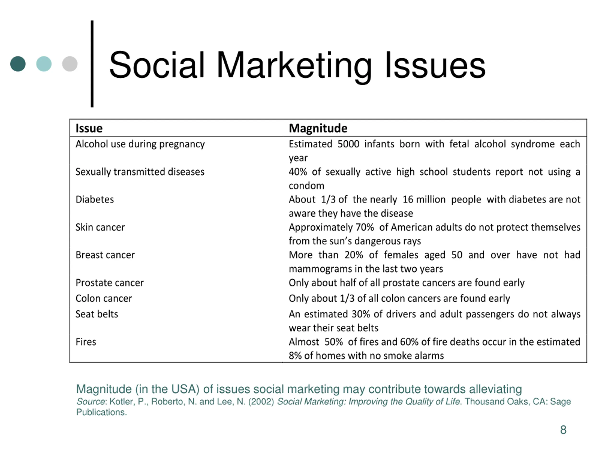 Social Marketing Issues Issue Alcohol use during pregnancy Magnitude Estimated 5000 infants born with fetal alcohol syndrome each year 40% of sexually active high school students report not using a condom About 1/3 of the nearly 16 million people with diabetes are not aware they have the disease Approximately 70% of American adults do not protect themselves from the sun s dangerous rays More than 20% of females aged 50 and over have not had mammograms in the last two years Only about half of all prostate cancers are found early Only about 1/3 of all colon cancers are found early An estimated 30% of drivers and adult passengers do not always wear their seat belts Almost 50% of fires and 60% of fire deaths occur in the estimated 8% of homes with no smoke alarms Sexually transmitted diseases Diabetes Skin cancer Breast cancer Prostate cancer Colon cancer Seat belts Fires Magnitude (in the USA) of issues social marketing may contribute towards alleviating Source: Kotler, P., Roberto, N. and Lee, N. (2002) Social Marketing: Improving the Quality of Life. Thousand Oaks, CA: Sage Publications. 8