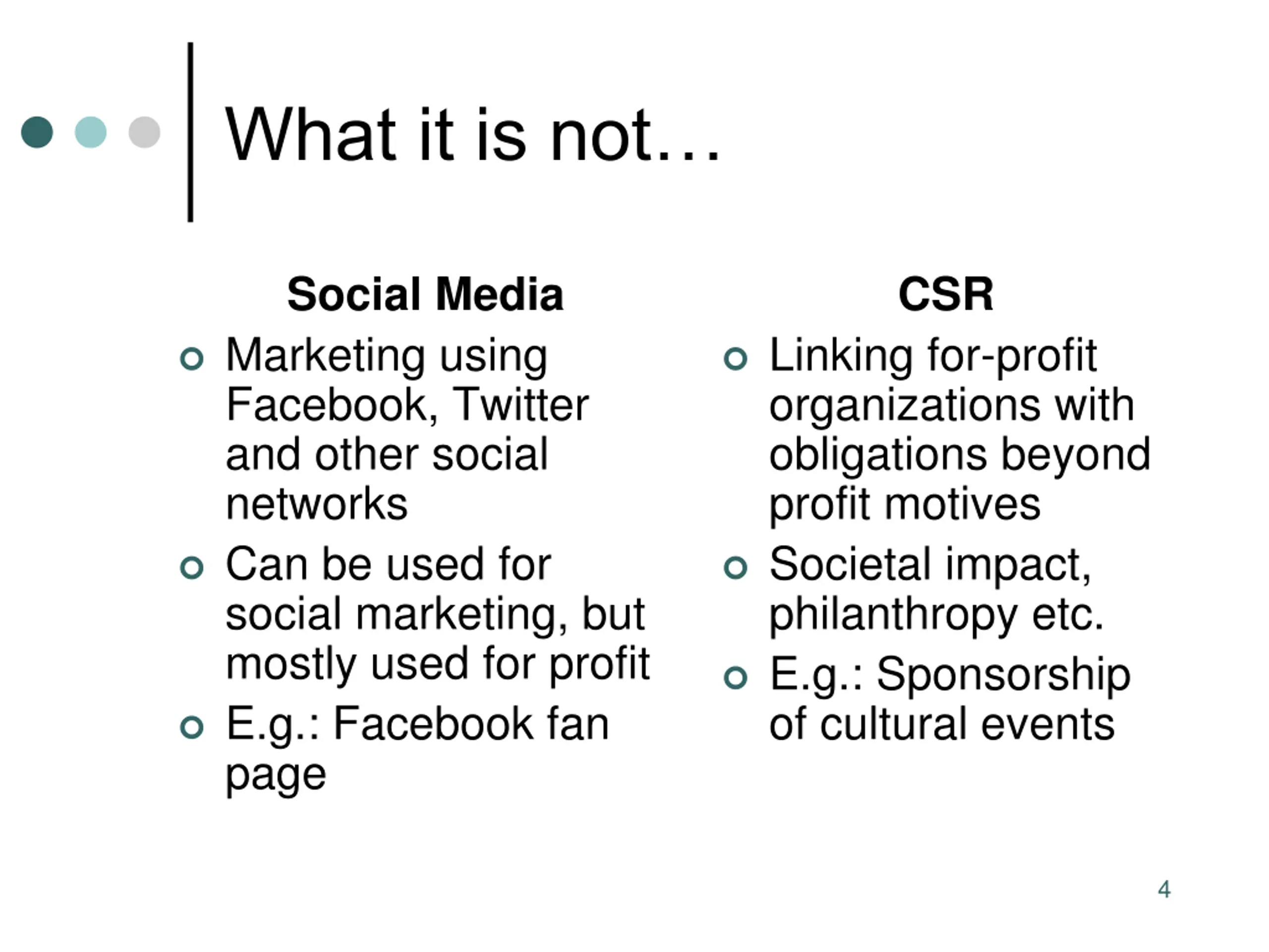 What it is not Social Media Marketing using Facebook, Twitter and other social networks Can be used for social marketing, but mostly used for profit E.g.: Facebook fan page CSR Linking for-profit organizations with obligations beyond profit motives Societal impact, philanthropy etc. E.g.: Sponsorship of cultural events 4