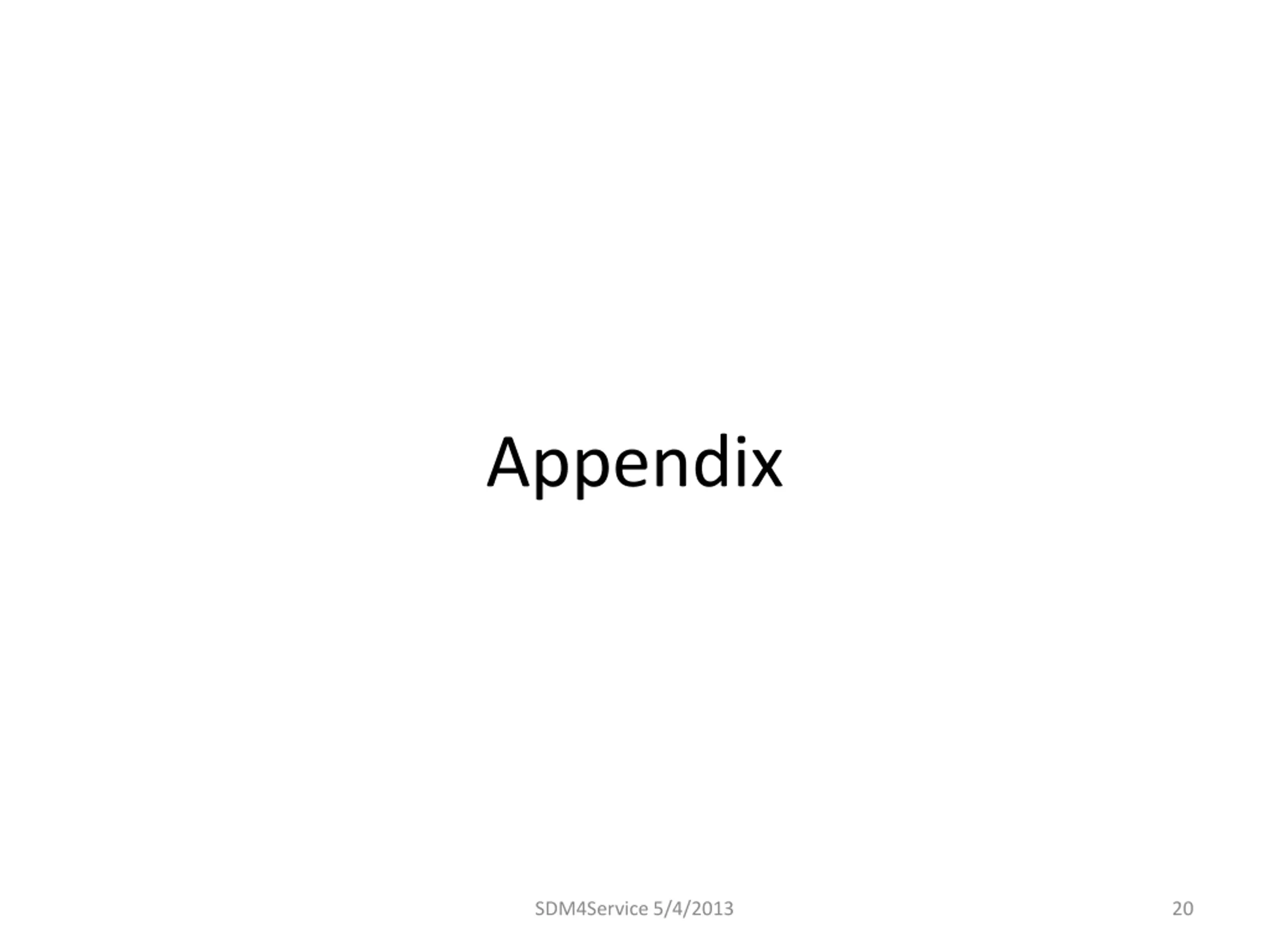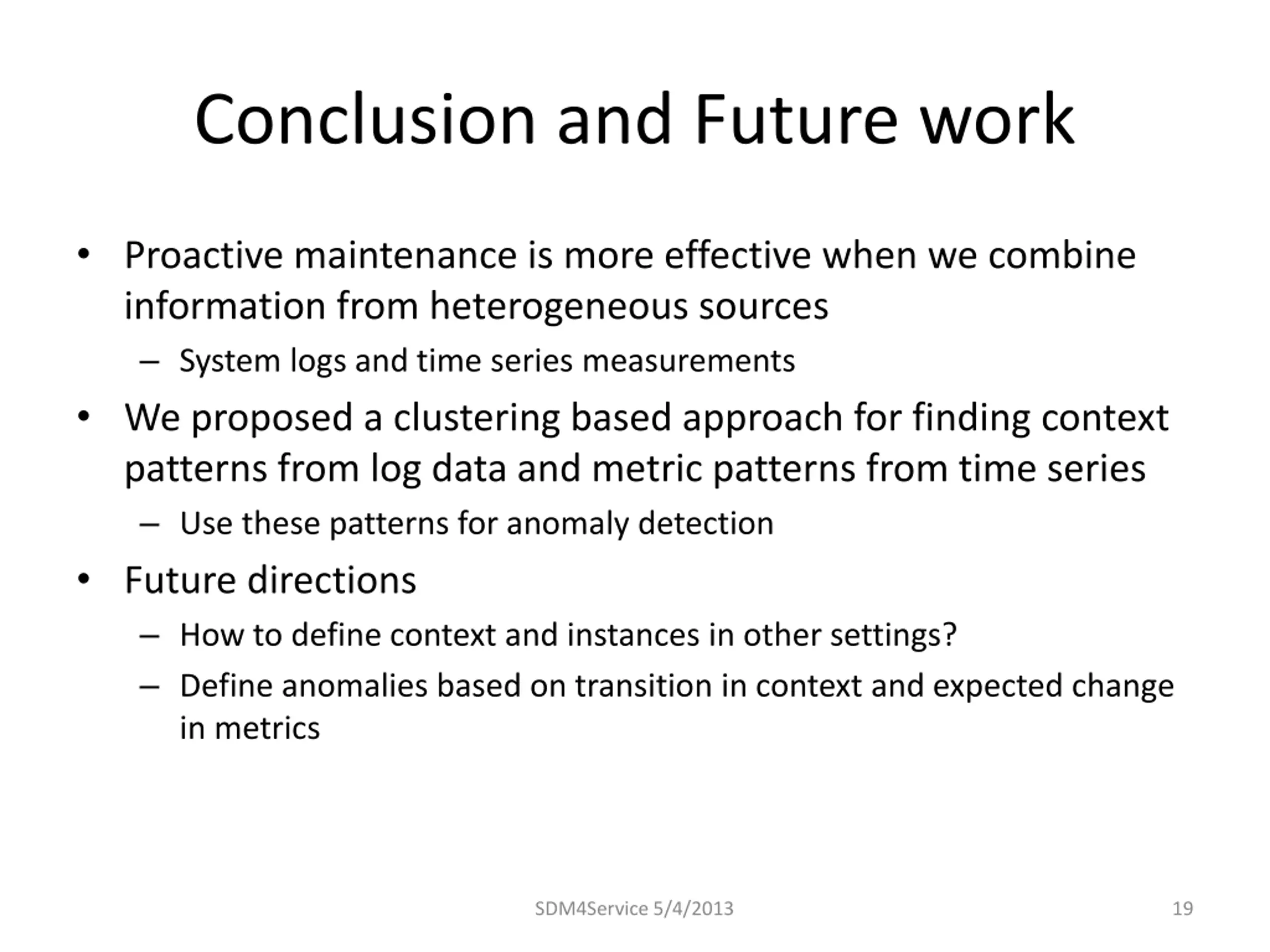 Conclusion and Future work Proactive maintenance is more effective when we combine information from heterogeneous sources System logs and time series measurements We proposed a clustering based approach for finding context patterns from log data and metric patterns from time series Use these patterns for anomaly detection Future directions How to define context and instances in other settings? Define anomalies based on transition in context and expected change in metrics SDM4Service 5/4/2013 19