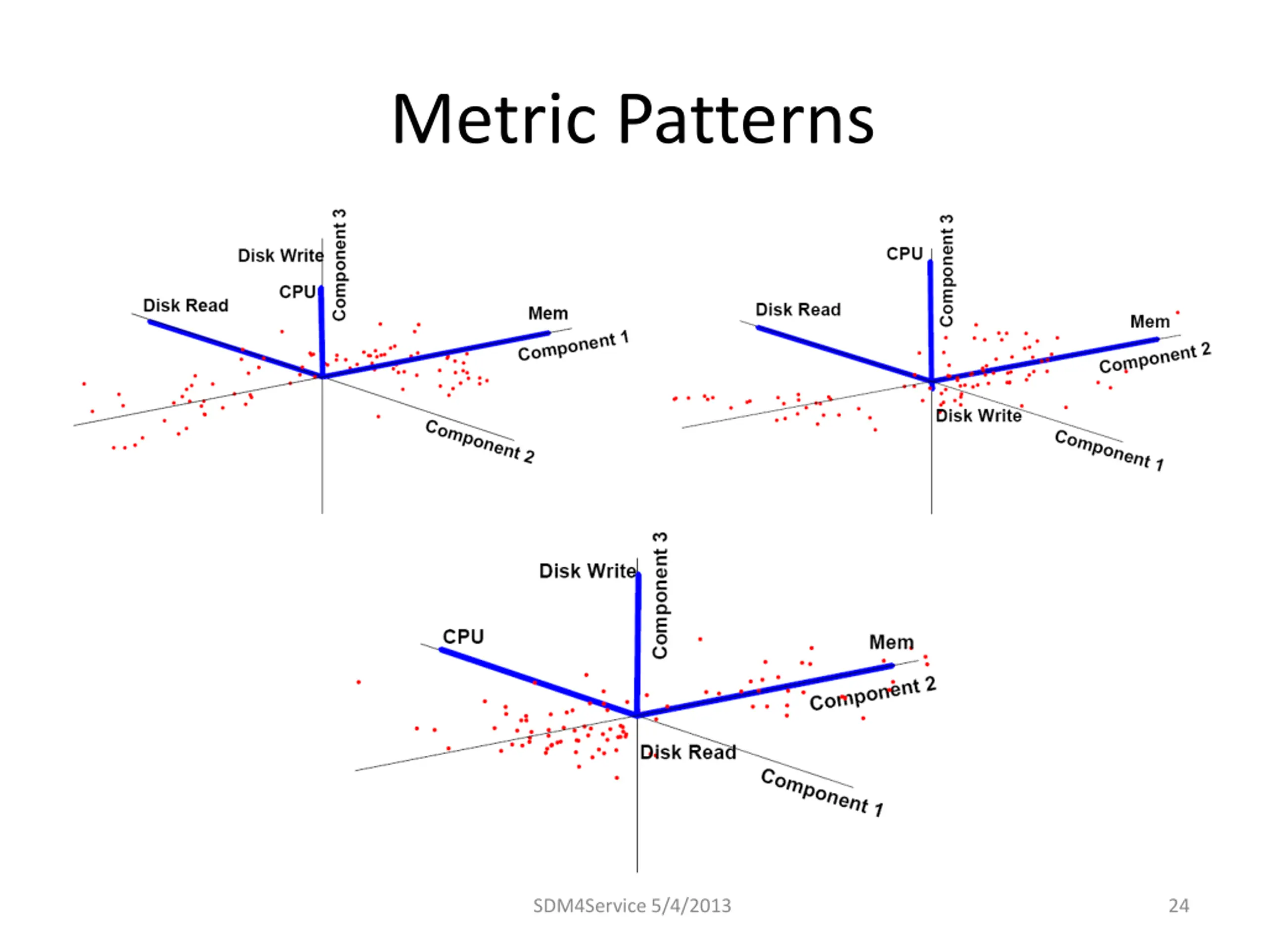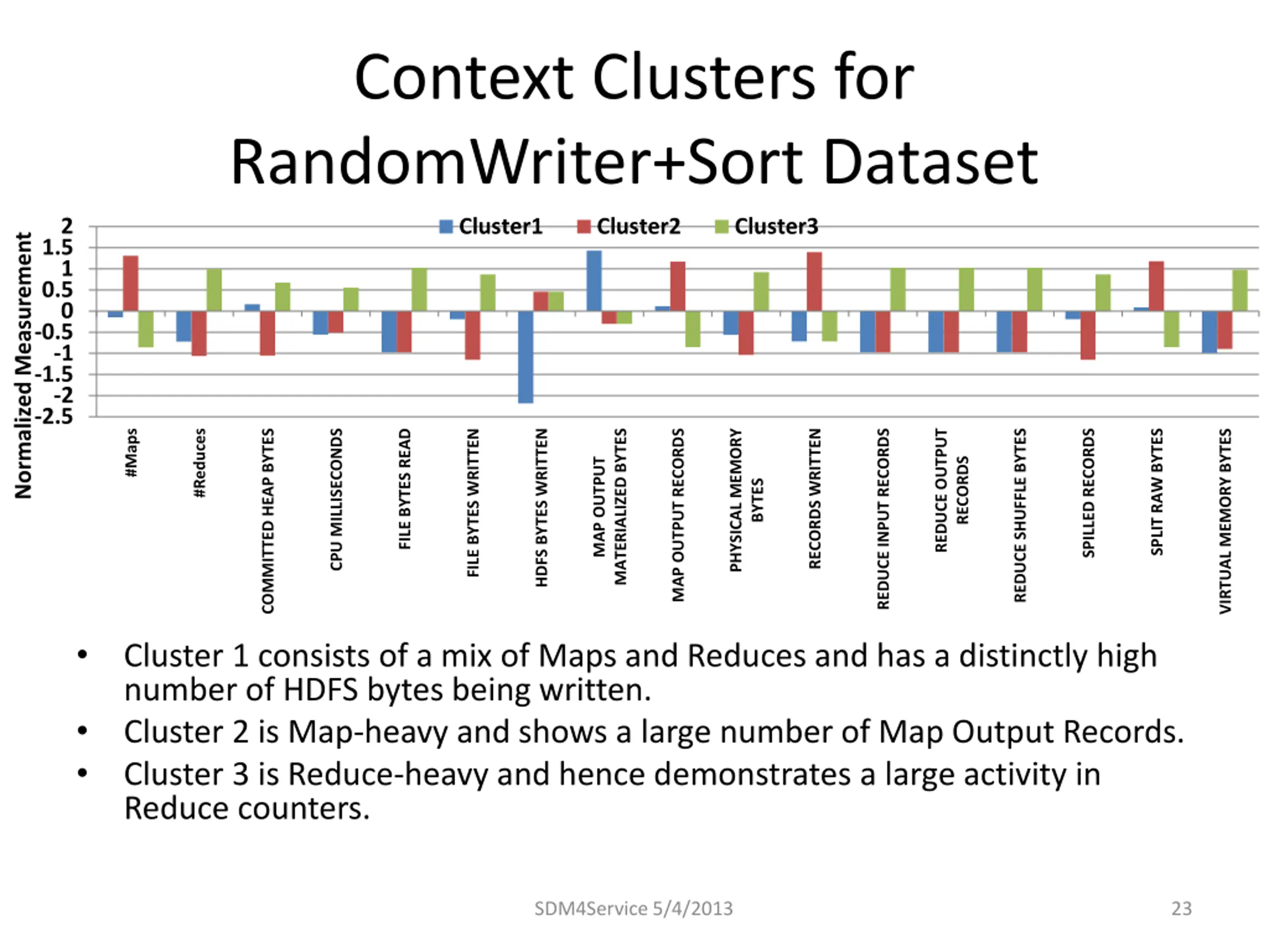 Context Clusters for RandomWriter+Sort Dataset 2 Cluster1 Cluster2 Cluster3 Normalized Measurement 1.5 1 0.5 0 -0.5 -1 -1.5 -2 -2.5 #Reduces HDFS BYTES WRITTEN REDUCE OUTPUT #Maps RECORDS WRITTEN REDUCE SHUFFLE BYTES REDUCE INPUT RECORDS SPLIT RAW BYTES COMMITTED HEAP BYTES SPILLED RECORDS MAP OUTPUT RECORDS CPU MILLISECONDS MATERIALIZED BYTES PHYSICAL MEMORY FILE BYTES WRITTEN FILE BYTES READ VIRTUAL MEMORY BYTES RECORDS MAP OUTPUT BYTES Cluster 1 consists of a mix of Maps and Reduces and has a distinctly high number of HDFS bytes being written. Cluster 2 is Map-heavy and shows a large number of Map Output Records. Cluster 3 is Reduce-heavy and hence demonstrates a large activity in Reduce counters. SDM4Service 5/4/2013 23