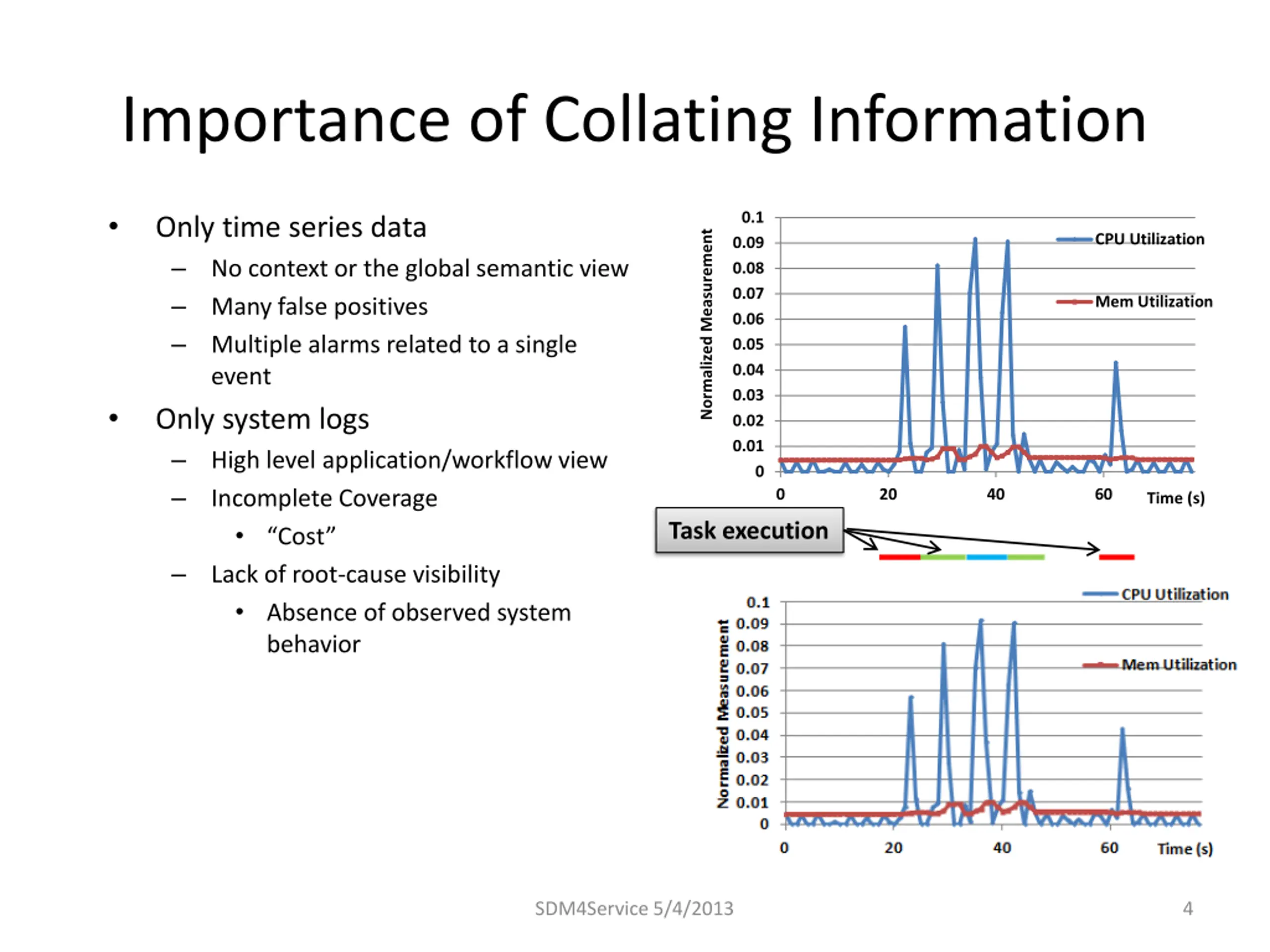 Importance of Collating Information 0.1 Only time series data No context or the global semantic view Many false positives Multiple alarms related to a single event Only system logs High level application/workflow view Incomplete Coverage Cost Lack of root-cause visibility Absence of observed system behavior Normalized Measurement CPU Utilization 0.09 0.08 0.07 Mem Utilization 0.06 0.05 0.04 0.03 0.02 0.01 0 0 20 40 60 Time (s) Task execution SDM4Service 5/4/2013 4