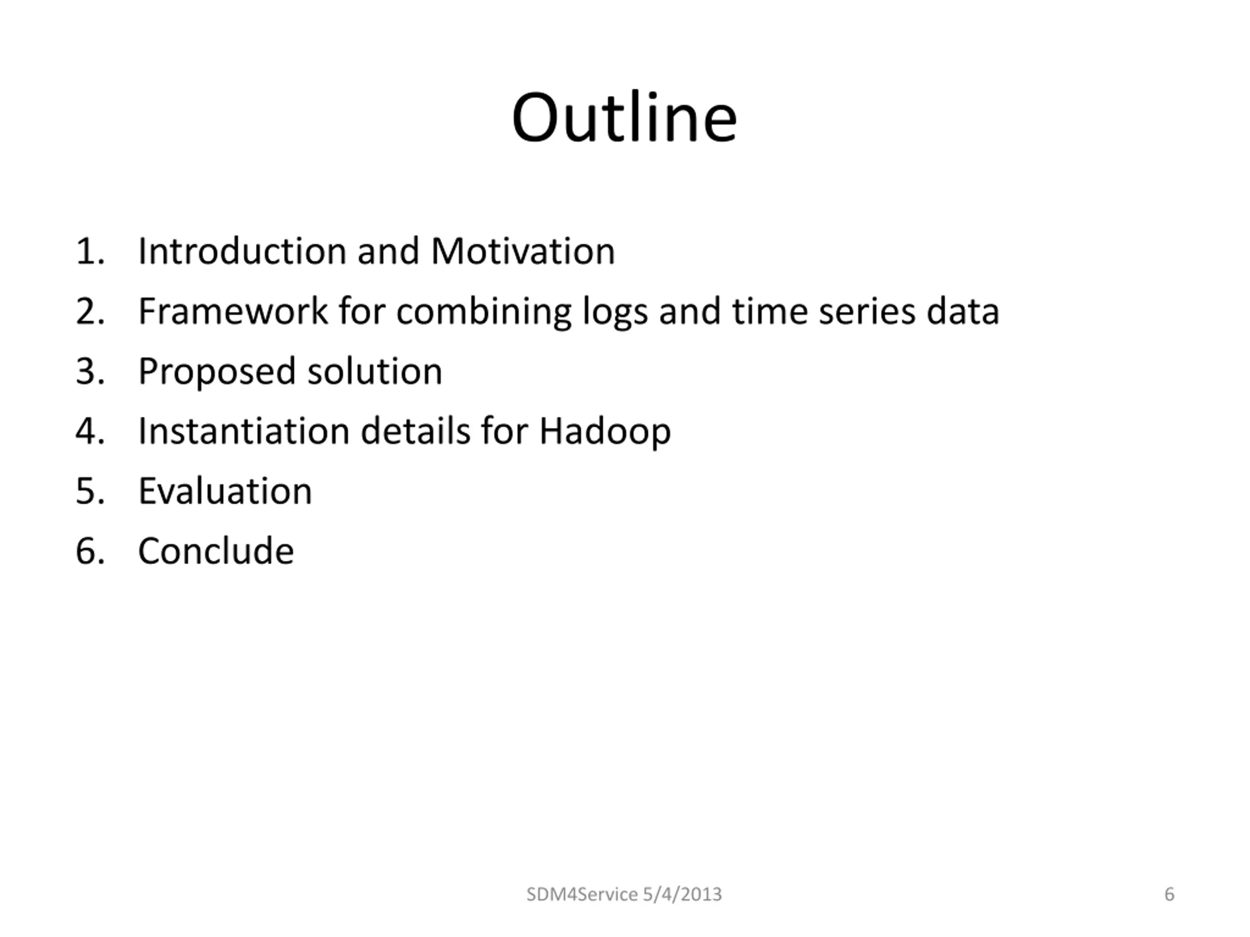 Outline 1. Introduction and Motivation 2. Framework for combining logs and time series data 3. Proposed solution 4. Instantiation details for Hadoop 5. Evaluation 6. Conclude SDM4Service 5/4/2013 6