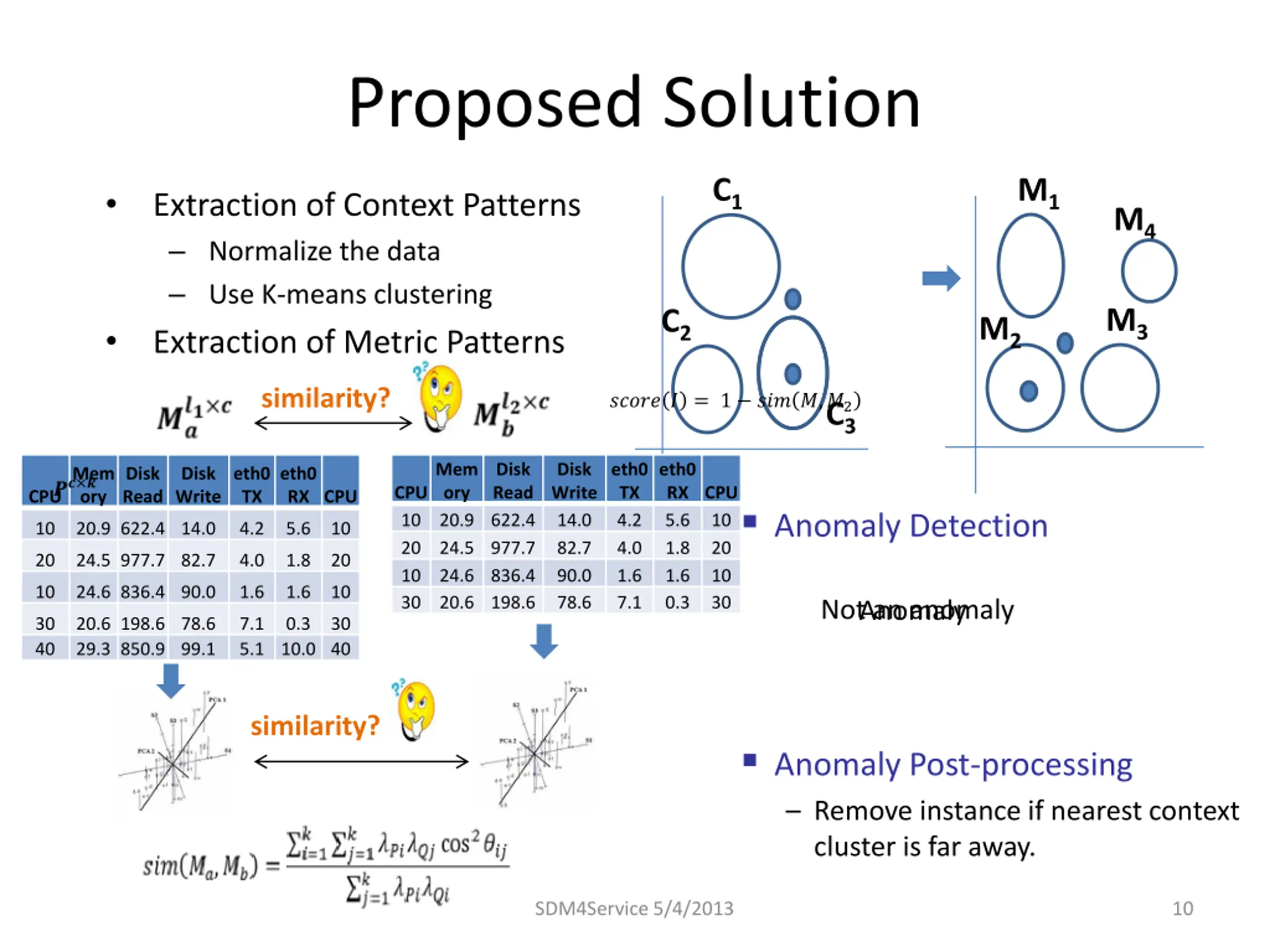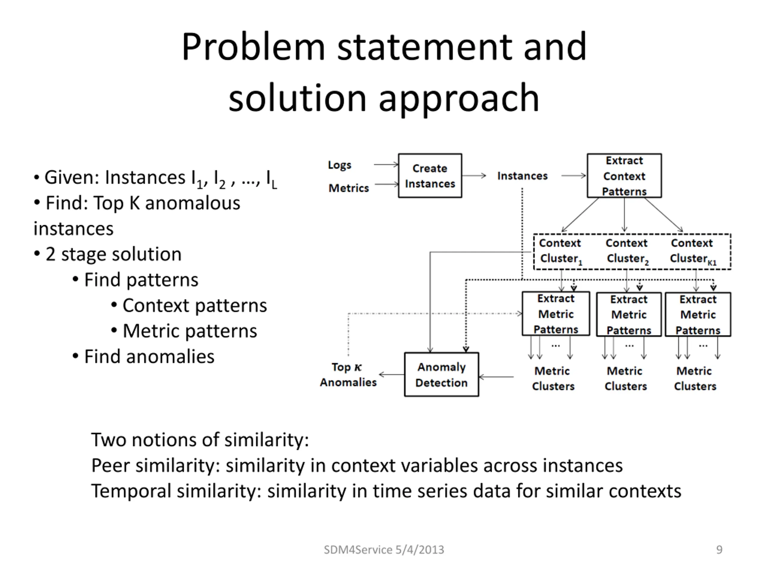 Problem statement and solution approach Given: Instances I1, I2, , IL Find: Top K anomalous instances 2 stage solution Find patterns Context patterns Metric patterns Find anomalies Two notions of similarity: Peer similarity: similarity in context variables across instances Temporal similarity: similarity in time series data for similar contexts SDM4Service 5/4/2013 9