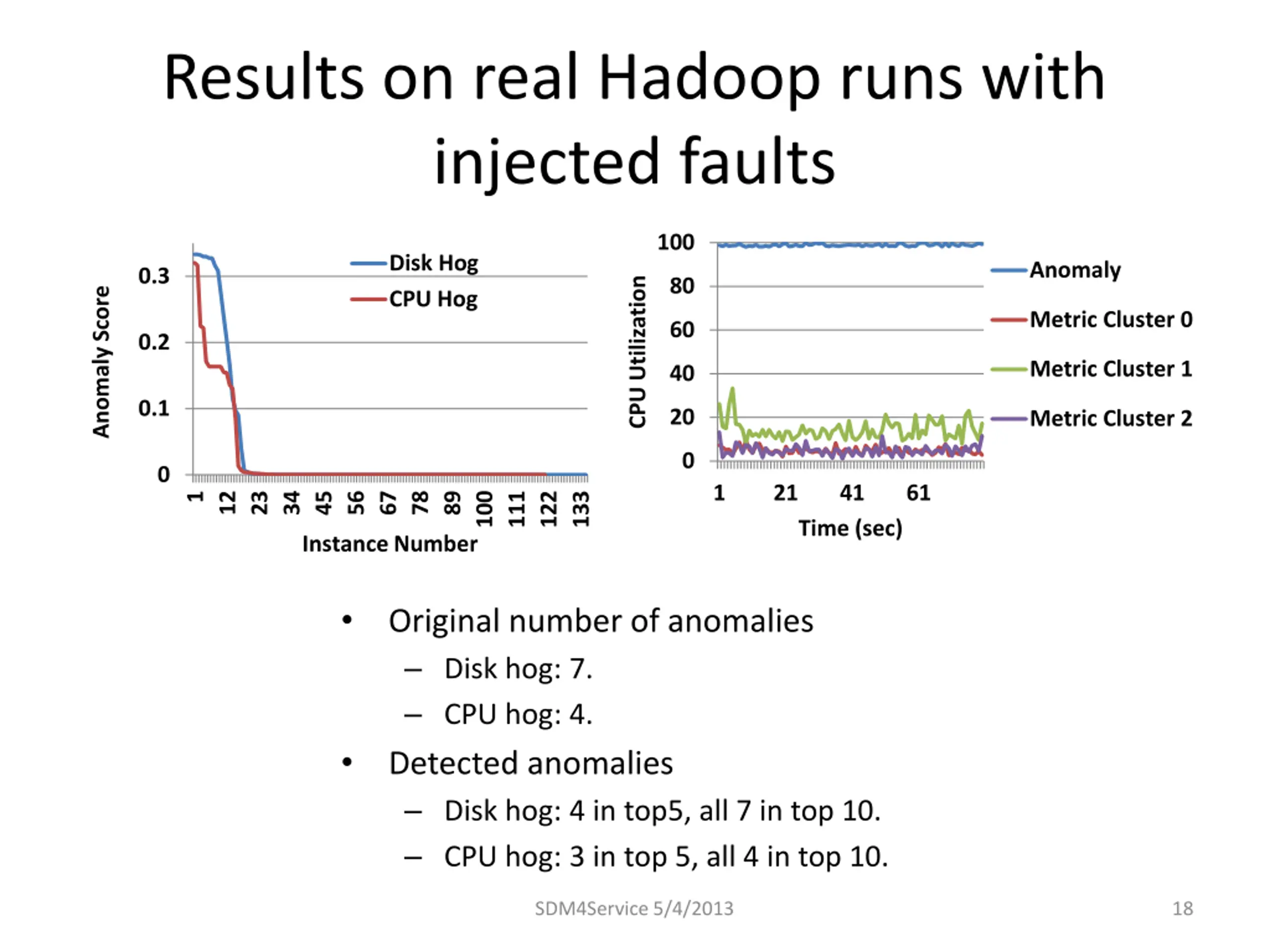 Results on real Hadoop runs with injected faults 100 Disk Hog CPU Hog Anomaly 0.3 80 CPU Utilization Anomaly Score Metric Cluster 0 60 0.2 Metric Cluster 1 40 0.1 20 Metric Cluster 2 0 0 1 21 41 61 1 12 23 34 45 56 67 78 89 100 111 122 133 Time (sec) Instance Number Original number of anomalies Disk hog: 7. CPU hog: 4. Detected anomalies Disk hog: 4 in top5, all 7 in top 10. CPU hog: 3 in top 5, all 4 in top 10. SDM4Service 5/4/2013 18