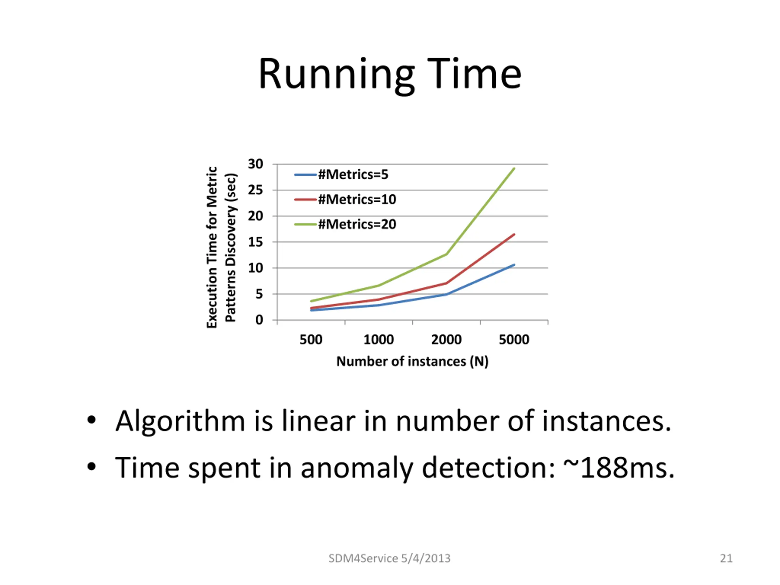Running Time 30 Execution Time for Metric #Metrics=5 Patterns Discovery (sec) 25 #Metrics=10 20 #Metrics=20 15 10 5 0 500 1000 2000 5000 Number of instances (N) Algorithm is linear in number of instances. Time spent in anomaly detection: ~188ms. SDM4Service 5/4/2013 21