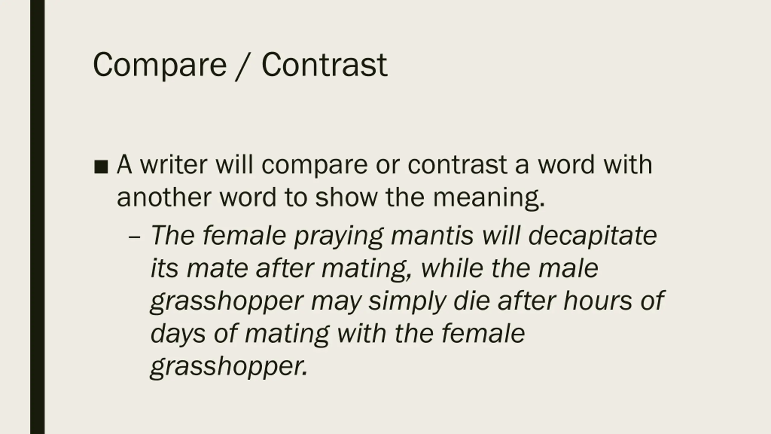 Compare / Contrast A writer will compare or contrast a word with another word to show the meaning. The female praying mantis will decapitate its mate after mating, while the male grasshopper may simply die after hours of days of mating with the female grasshopper.
