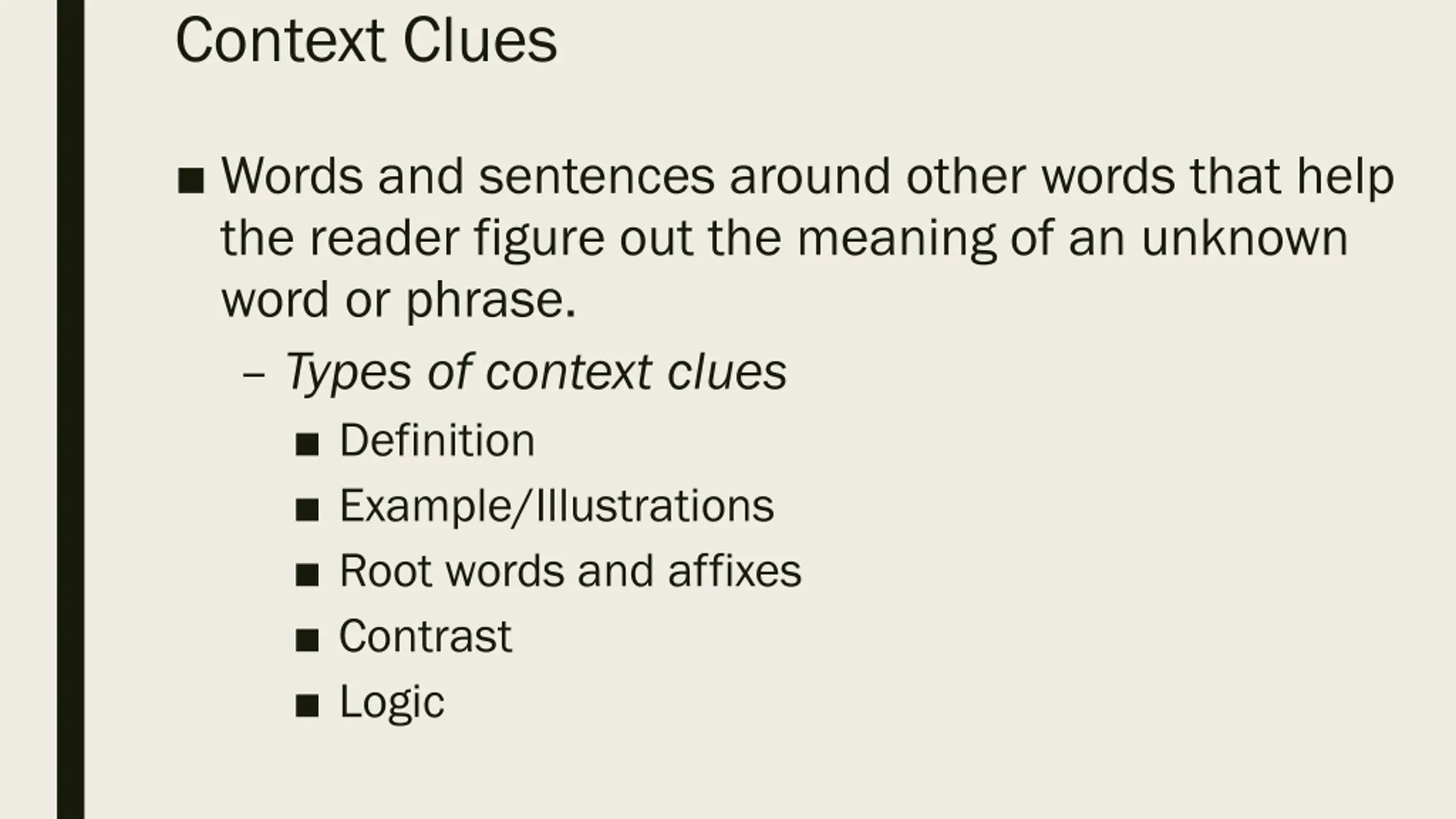 Context Clues Words and sentences around other words that help the reader figure out the meaning of an unknown word or phrase. Types of context clues Definition Example/Illustrations Root words and affixes Contrast Logic