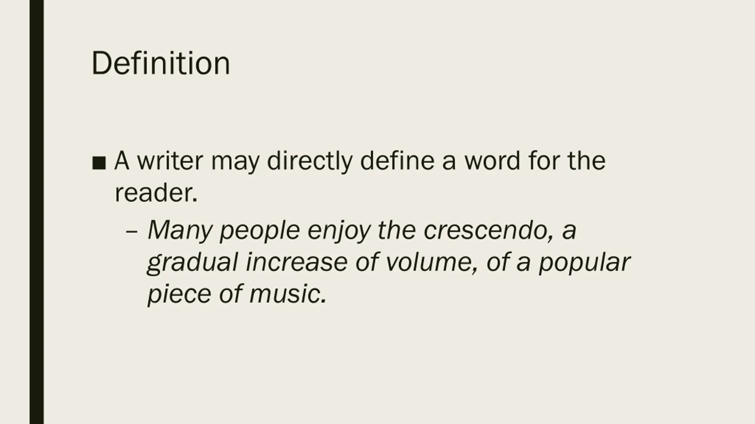 Definition A writer may directly define a word for the reader. Many people enjoy the crescendo, a gradual increase of volume, of a popular piece of music.