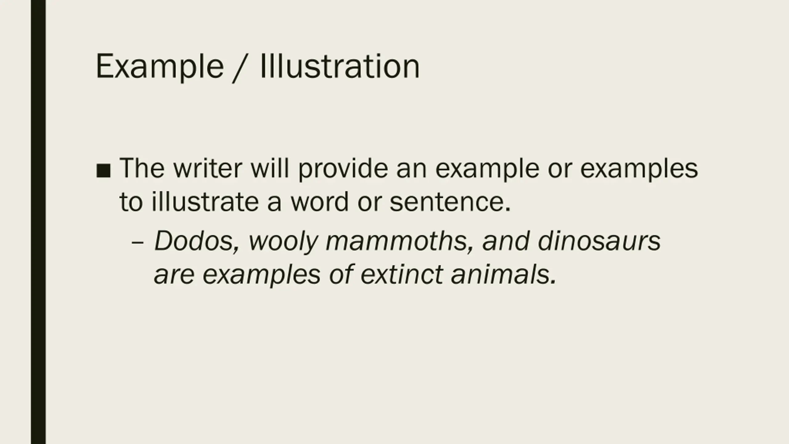 Example / Illustration The writer will provide an example or examples to illustrate a word or sentence. Dodos, wooly mammoths, and dinosaurs are examples of extinct animals.