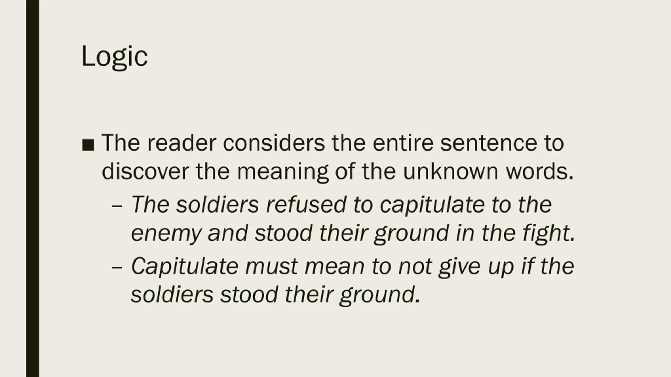 Logic The reader considers the entire sentence to discover the meaning of the unknown words. The soldiers refused to capitulate to the enemy and stood their ground in the fight. Capitulate must mean to not give up if the soldiers stood their ground.