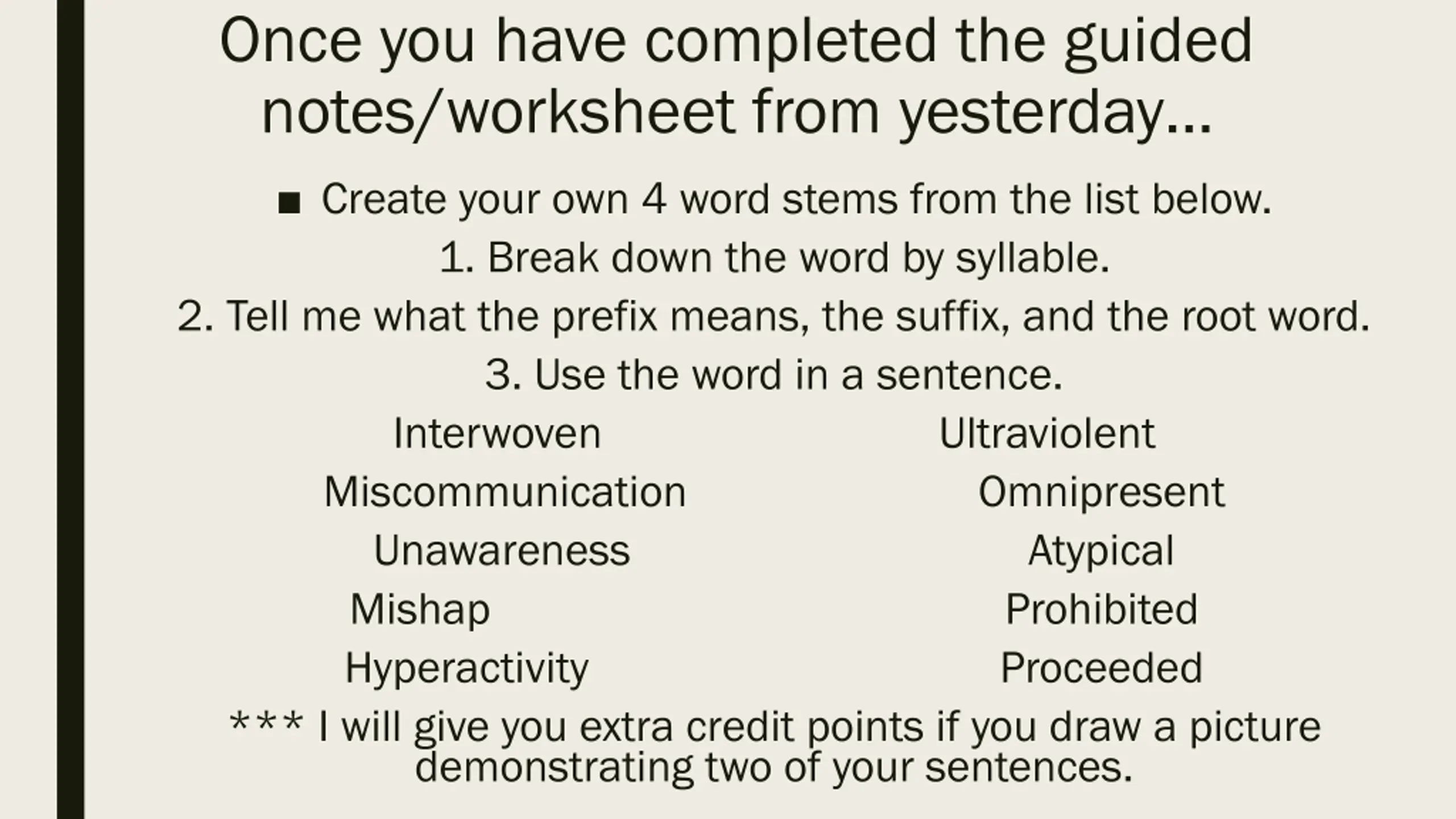 Once you have completed the guided notes/worksheet from yesterday Create your own 4 word stems from the list below. 1. Break down the word by syllable. 2. Tell me what the prefix means, the suffix, and the root word. 3. Use the word in a sentence. Interwoven Miscommunication Unawareness Mishap Hyperactivity *** I will give you extra credit points if you draw a picture demonstrating two of your sentences. Ultraviolent Omnipresent Atypical Prohibited Proceeded